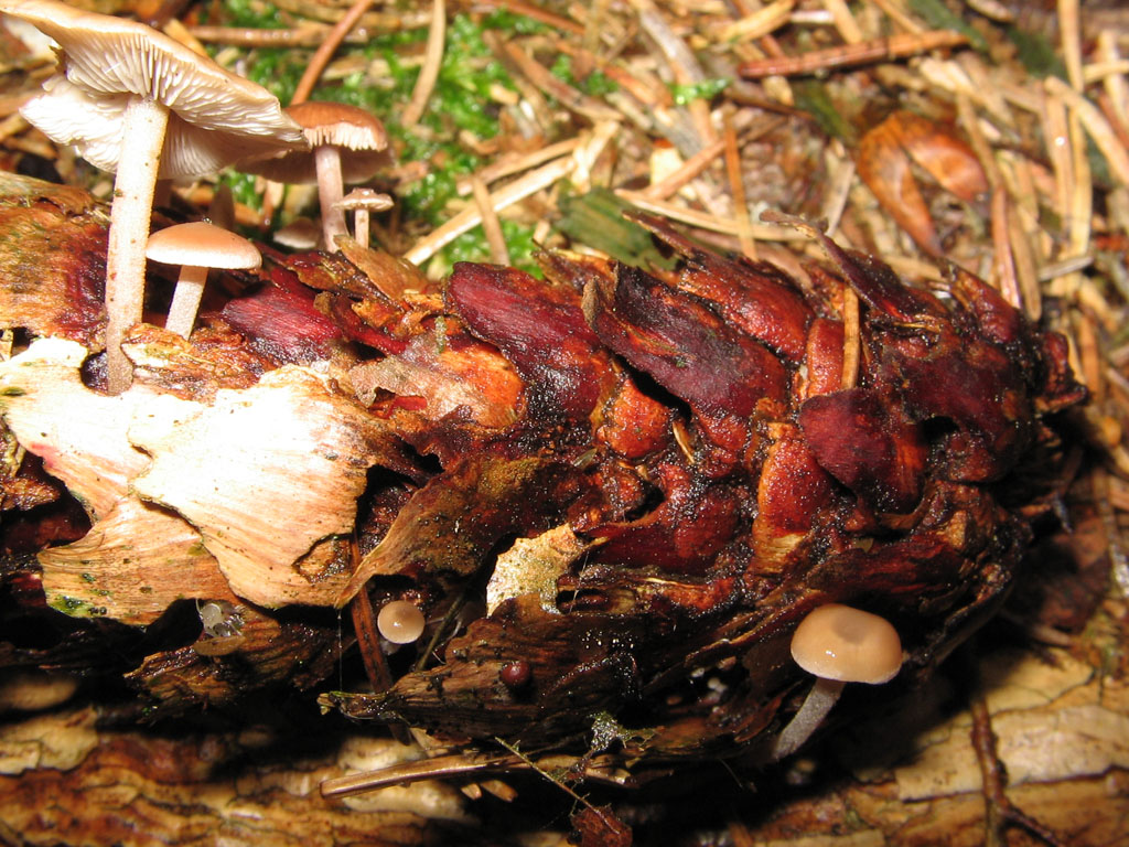 4 - Gut vor Kälte geschützt und erst nach reichlich Umbauarbeiten an ihrem Nadelgeästhäuschen zugänglich gemacht, hatten sich diese Unbekannten eingebunkert. (Lactarius spec.)