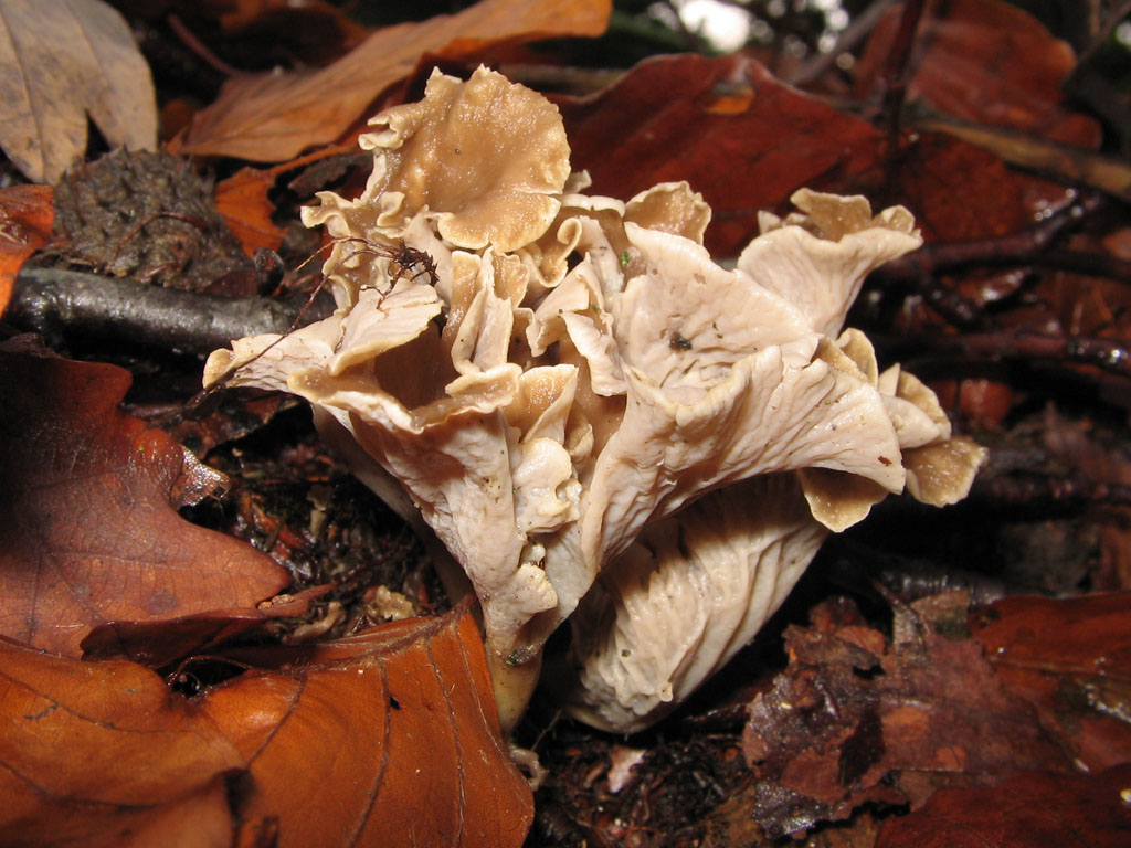 8 - Diese Trompetenpfifferlinge (Cantharellus tubaeformis) versuchten durch Tarnung der Kälte zu entkommen, womit sie auch einer Entdeckung durch mich fast entgangen wären. Erst als ein in der Nähe befindlicher Semmelstoppelpilz (Hydnum spec.) orange aus dem Laub hervorleuchtete, fielen sie mir ins Auge. Von oben betrachtet hielt ich sie erst für altersschwache Verwandte des Hydnums, aber ein Blick unters Dach zeigte, dass die Verwandschaft etwas entfernter ausfiel.