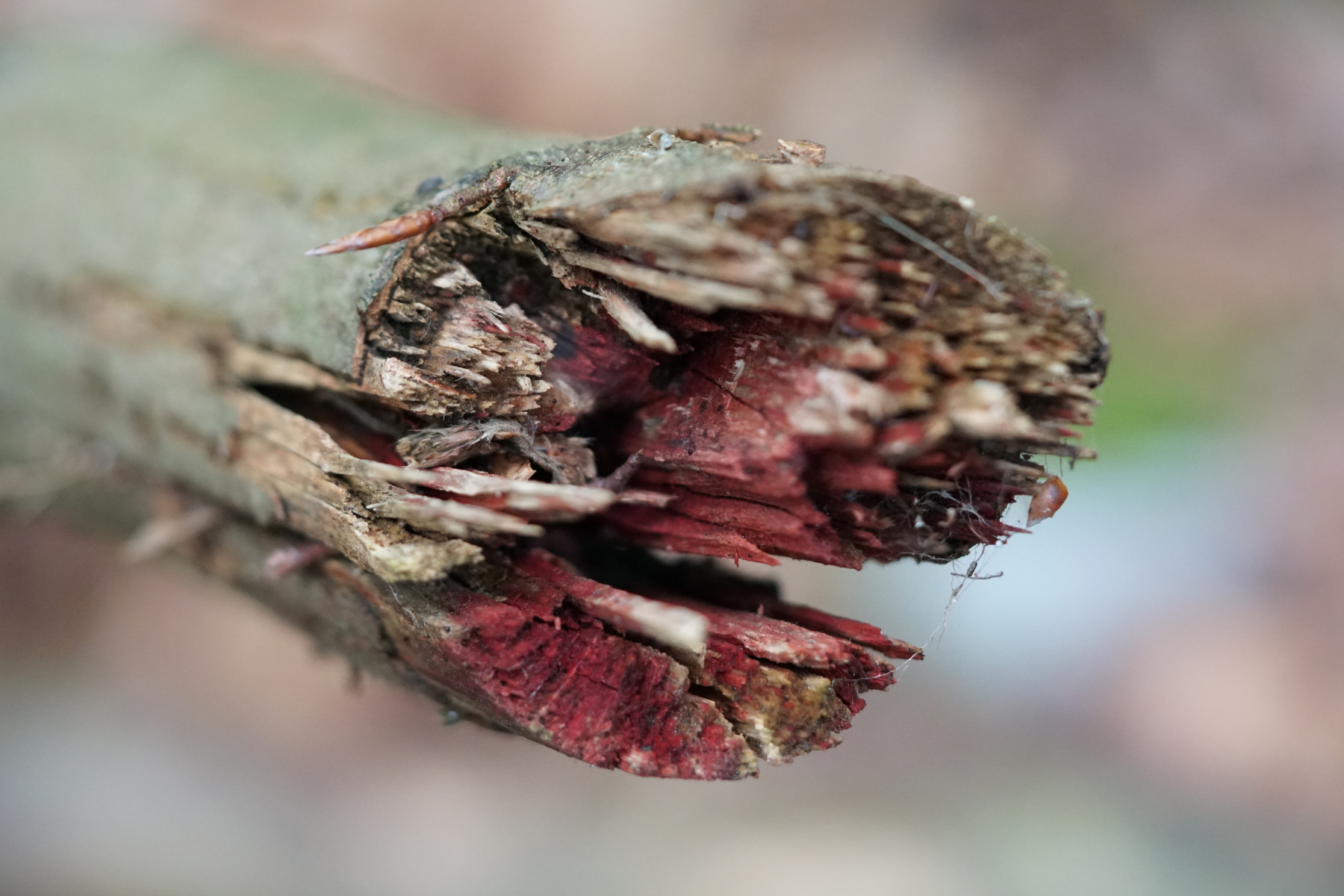 Aber weiter nichts. Kein einziger Täubling, kein einziger Dachpilz. Drei kaputte Stinkmorcheln gab es noch und die kleinen Käsepilzchen oder Verwandten waren da. Aber weiter nichts! Selbst an Baumpilzen gab es wenig zu sehen. Rotes Holz fiel mir dafür häufiger auf. Auch pilzgemacht.