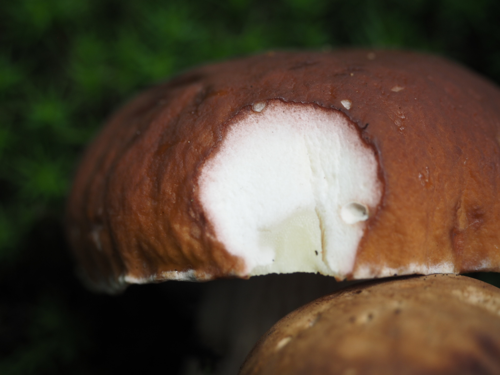 Und gerade als ich einige Mehlräslinge, Clitopilus prunulus ablichte merke ich daß da auch ein Steinpilz neben steht.