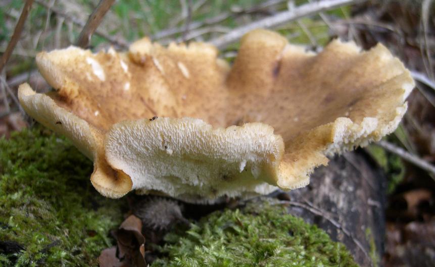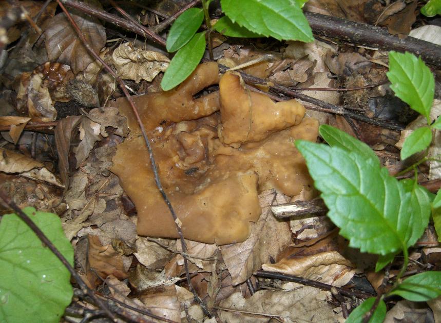 11. Hochgerippte Bechermorchel ? Samtige Oberfläche, einen erkennbaren Stiel gab es für mich nicht. Flächig wie eine ausgebreitete Männerhand. Ich nahm zwei mit, weil ich sie daheim näher anschauen wollte. Im Baumwollbeutel (daheim) schien es, als dampften sie von der Hutoberseite. Sie wuchsen auf Holzspänen vom vorherigen Kettensägen, Laubholz, vmtl. Buche.