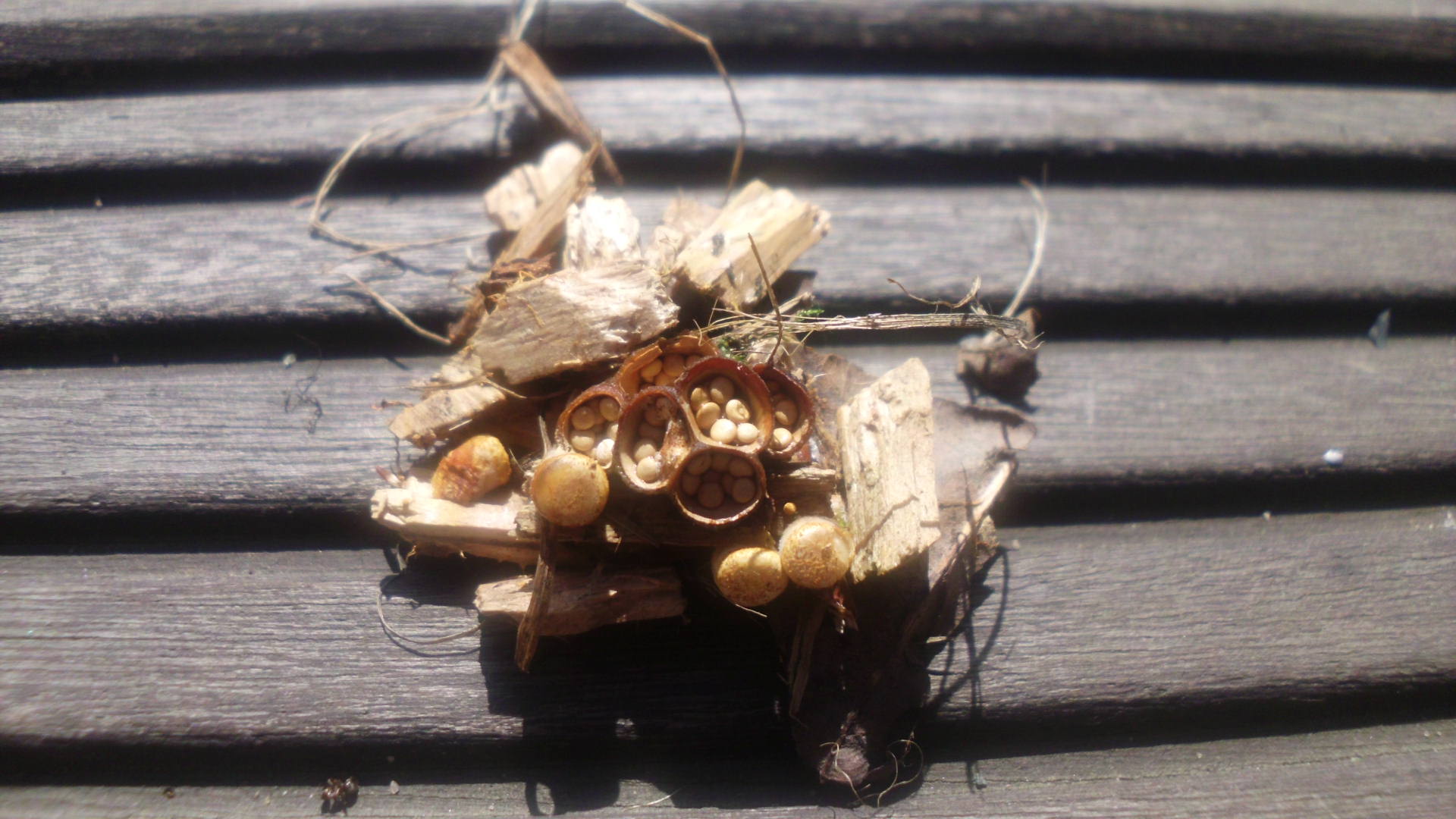 Jung gelb, helle Linsen im Inneren (Peridiolen) und Innenseite ungestreift, wäre auch für mich Crucibulum laeve (Tiegel-Teuerling).