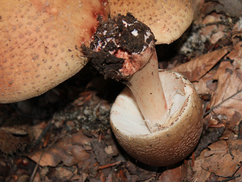 Mit einigen Grundkenntnissen ausgestattet und etwas Erfahrung als "Feldmykologe" käme mir beim Aussehen dieses Pilzes (Art der Beflockung, farbliche Aspekte des Hutes und rötliche Verfärbungen der Fraßstellen und der Knolle) nun wirklich nichts anderes als ein Perlpilz (A. rubescens) in den Sinn!
