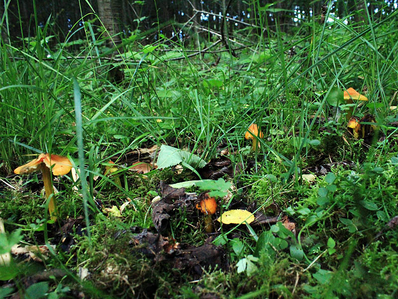 Diese Pilzgruppe habe ich in einem jungen Laubwald in einer Schneise gefunden. Der Stil ist Neongrün was ohne Blitz nur unzureichend herauskommt und mit Blitz überhaupt nicht.