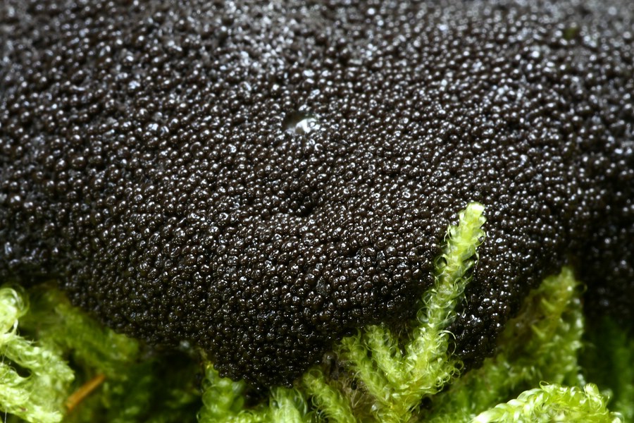 Er zeigte sich auch heute während des Stadiums der Fruktifikation noch weich, eine farbliche Veränderung und die Veränderungen der Oberfläche (die Einzelsporocarpien bilden nun eine glatte, aber rissige Oberfläche) sind aber offensichtlich.
