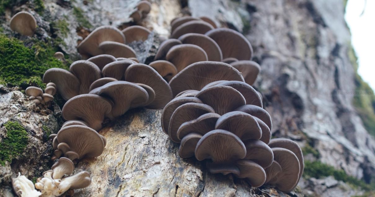 Zwei Bilder von Austernseitlingen. Der am Boden liegende Stamm hatte etwa zehn kleine Trauben mit je ca. 10-30 Fruchtkörpern: