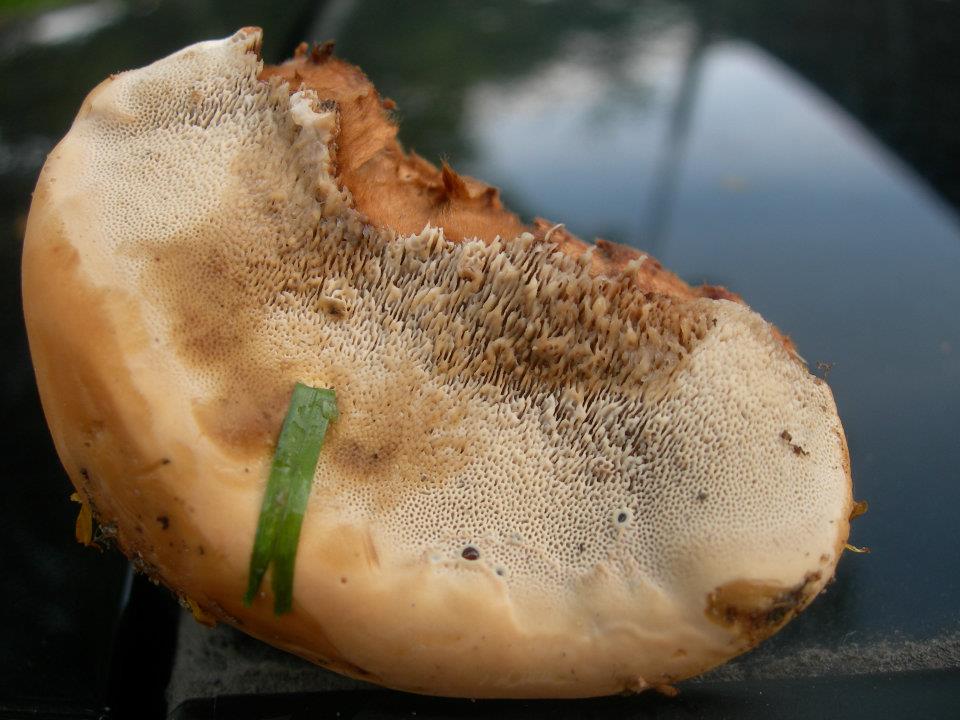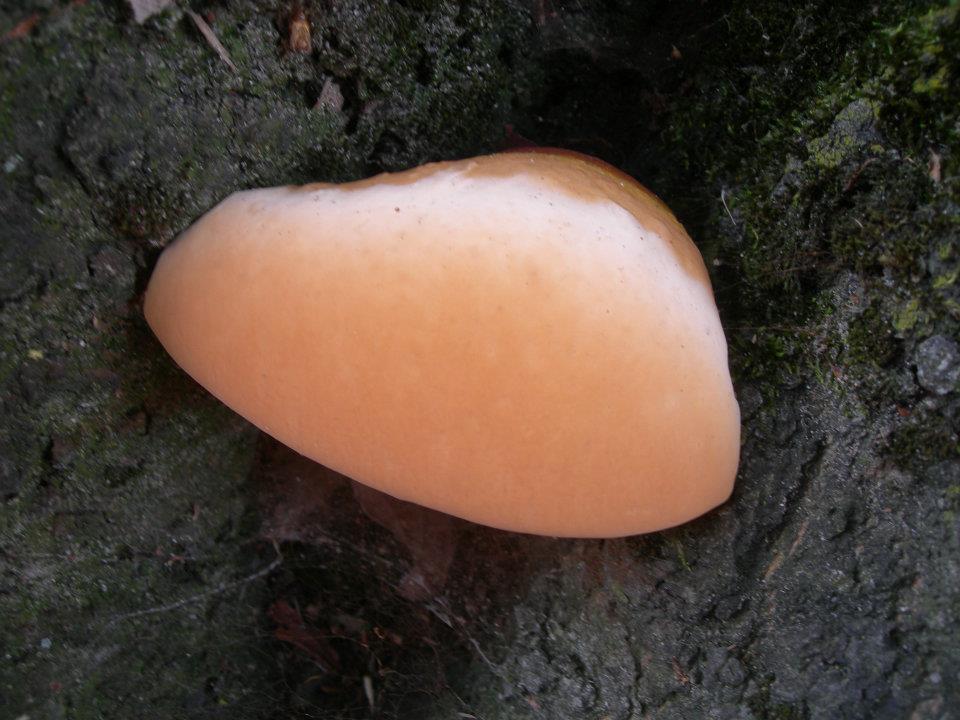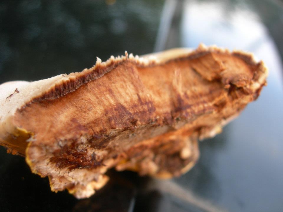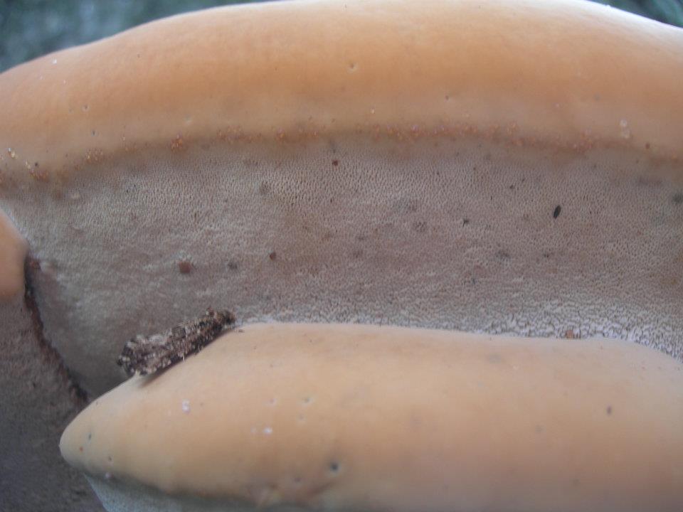 ---> "Fomitopsis pinicola" (Rotrandiger Baumschwamm) schließe ich aus. Diese Art hat jung eine andere Porenfarbe und andersfarbiges Hutfleisch. Typisch fur junge Fruchtkörper ist übrigens einehalbkugelige Gestalt und ein "altrosa Schein":---------------