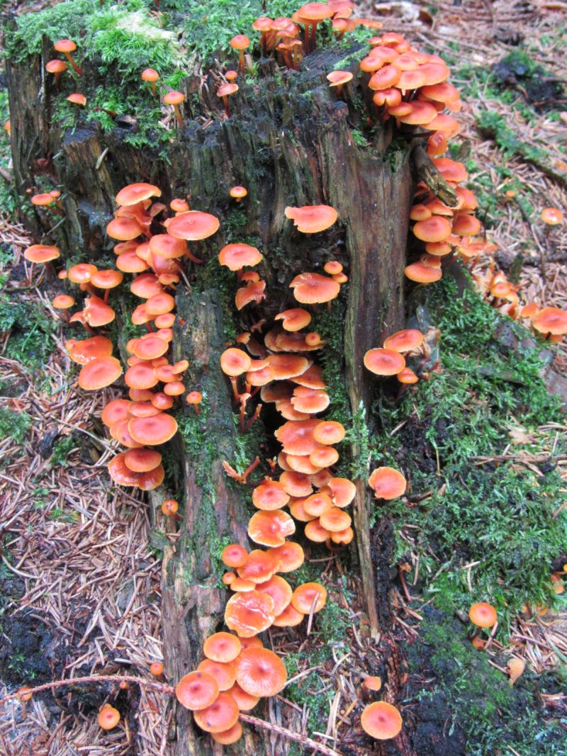 Die orangenen Pilzchen wo du erst Galerina marginata vermutet hast solltest du mal mit dem geselligen Glöckchennabeling ( Xeromphalina Campanella ) vergleichen
