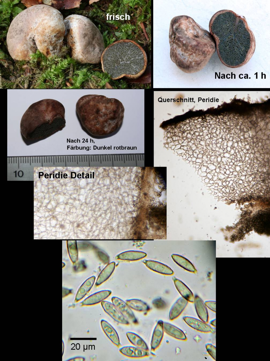 - In einem Mischwald (Buchen, Eichen und Fichten). Mehrer Pilze dieser Art wuchsen auf einem bemoosten Erdhaufen. Sie waren zum Teil im Erdreich versteckt. In der unmittelbaren Umgebung (ca. 2 m Umkreis) befanden sich nur junge Fichten. Ich würde den Gesellen als geruchlos bezeichnen. Im frischen Zustand hatten sie eine helle Weißfärbung, verfärbten sich jedoch bei Berührung rotbraun und nach einem Tag veränderte sich die Farbe zu dunkelrotbraun.