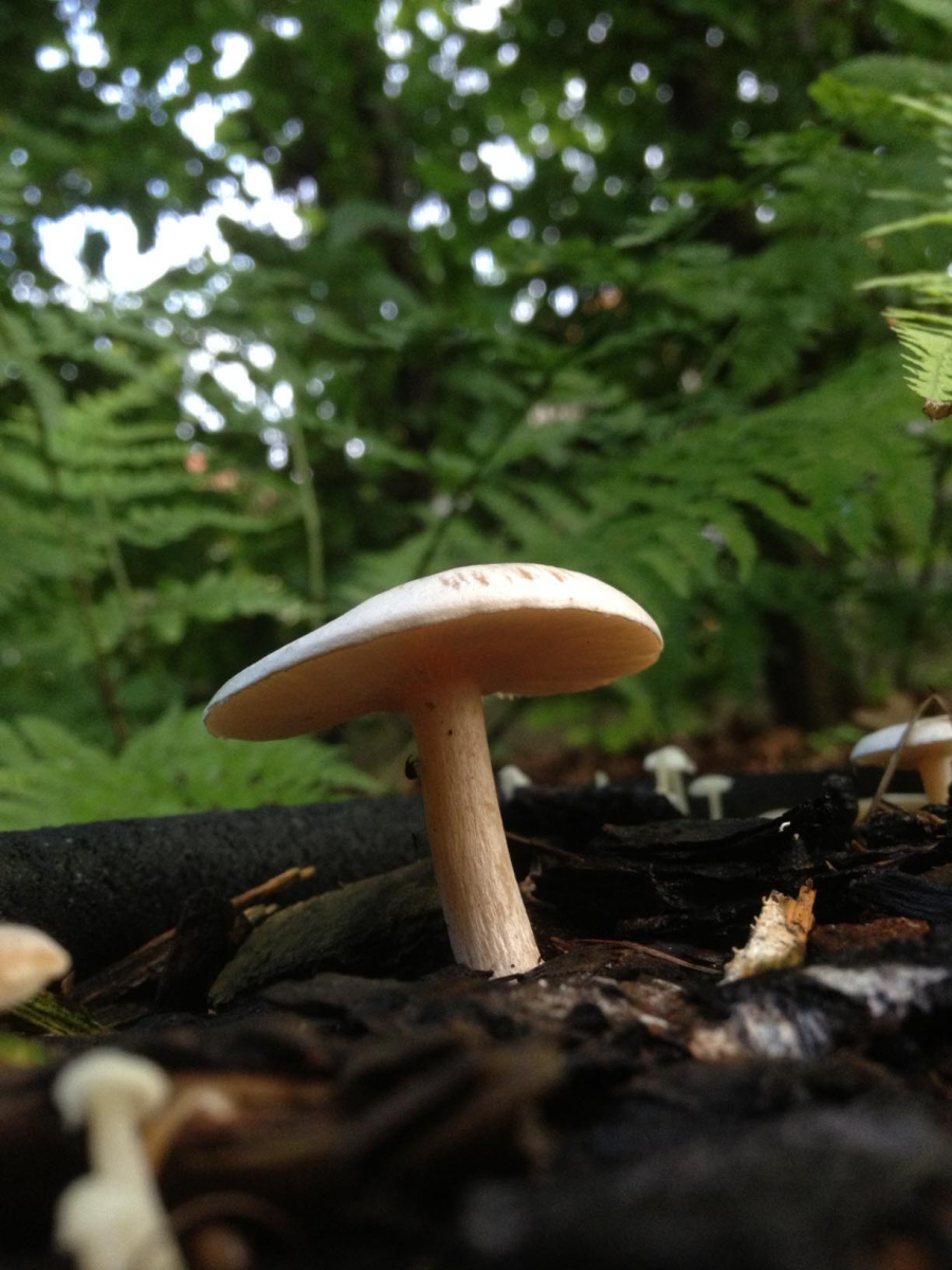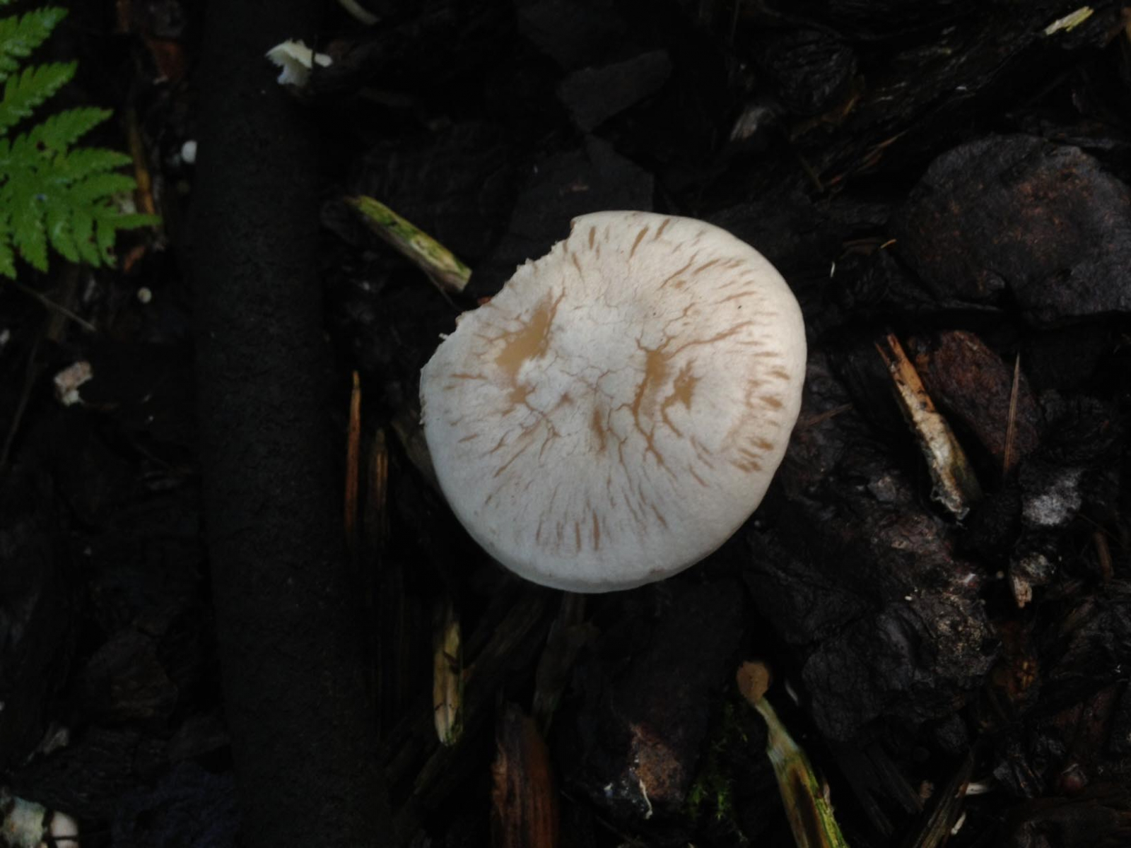 • Der Pilz tritt in einem Bereich von ca. 2,5 Meter x 1 Meter auf und es befinden sich ca. 100 Stück dort. Der Boden wird wegen der Farne/Hainbuchen künstlich bewässert. Ca. 8 cm. Rindenmulch.