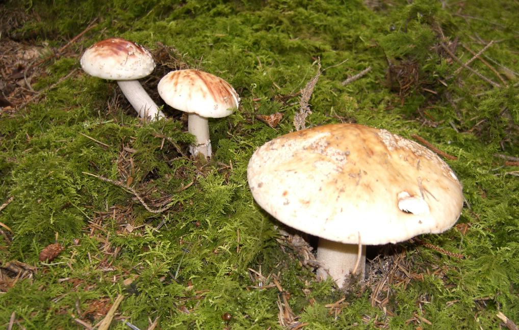 ich war heute auch noch eine Weile im Wald draußen und haben neben wenigen kleinen Goldröhrlingen, einem großen bereits "verabschiedeten" Goldröhrling (Hutdurchmesser ca. 15 cm), etlichen anderen für mich nicht näher bestimmbaren Täublingen dieses nette Trio gefunden. Der größte im Vordergrund hatte einen Hutdurchmesser von ca. 17 cm, die beiden anderen waren deutlich kleiner, geschätzte 13 und 10 cm Hutdurchmesser. Es sind Blätterpilze, "ummachen" wollte ich sie nicht. Geruch war für mich kein bestimmter feststellbar, das kann aber daran liegen, dass ich gerade ein klein wenig mit den Gräsern kämpfe. Der Baumbestand besteht im Wesentlichen aus Lärchen, Fichten, Buchen, sie wuchsen im selben Waldbereich wie die Goldröhrlinge. Der Hut machte einen trockenen Eindruck (im Gegensatz zu den Goldröhrlingen).