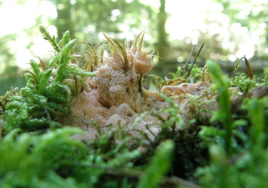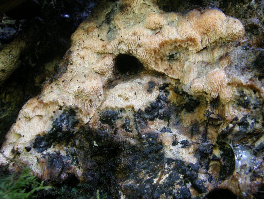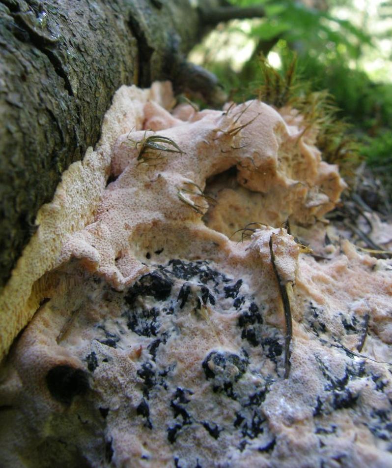 Schon ordentlich schwitzend, ging's auf dem Nachhauseweg noch mal bei Oligoporus Placenta vorbei. An einigen Stellen (1. Bild) verwandelt er sich jetzt schon langsam in Moder, an anderen wachsen ihm Haare aus Moos (2. Bild).