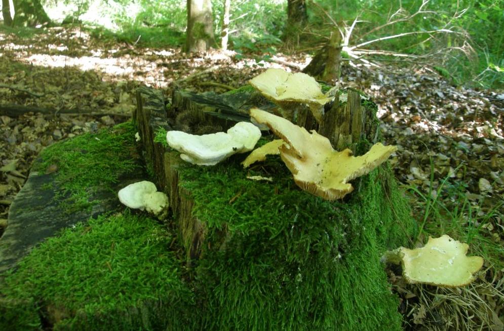 Diese beiden Pilze dürfen ruhig unbestimmt bleiben. Mir gefiel einfach nur die gemütliche Zweisamkeit auf diesem alten Buchenstrunk.