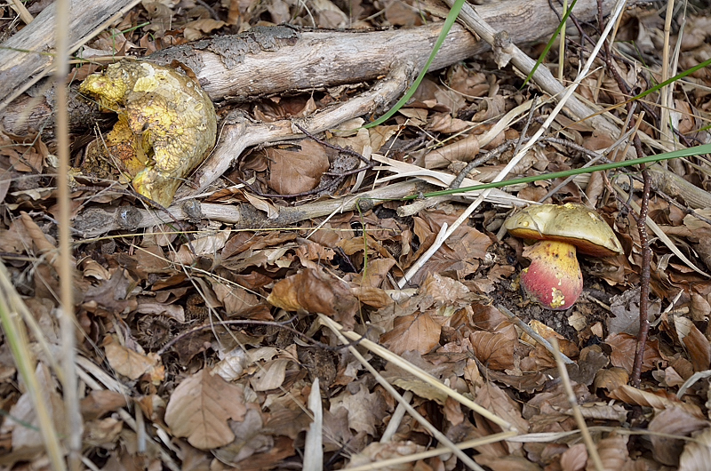Die Fundstelle der Satans-Röhrlinge. Am Standort waren insgesamt vier Exemplare verteten. Reinhold hatte am Vorabend bei Dunkelheit und mit Taschenlampe !!! nur den kleineren, aber fotogenen, Satans-Röhrling aufgespürt. Daneben war ein weiteres Exemplar, na ja ein ziemliches Wrack. Ein Meter weiter standen zwei weitere und noch größere Pilze, die waren aber völlig hinüber und schon im Pilzhimmel angelangt: