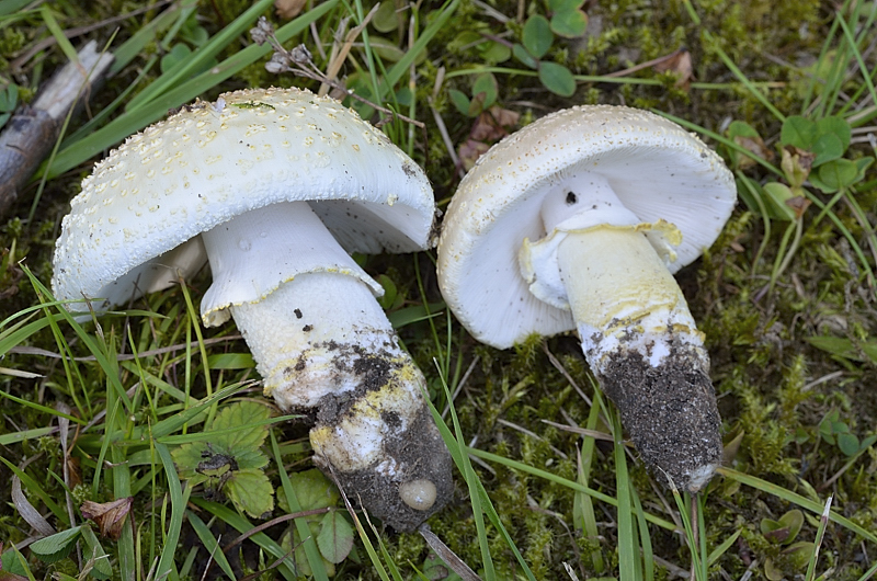 Neulich habe ich von der "magischen Eiche" berichtet. Am Mittwoch war ich wieder mit Reinhold Krakow verabredet und tourten durch zwei große Mischwaldgebiete im Mecklenburger Raum. Ich zeigte ihm jene Eiche, wo ich seit ein paar Jahren immer viele Sommer-Steinpilze, Flocken.- und Netzstielige Hexenröhrlinge, Anhängsel-Röhrlinge, Bitter-Röhrlinge auf engstem Raum finde. Als ich dort suchte, bemerkte ich wieder einige kleine unscheinbare Wulstlinge die ich immer in der Vergangenheit als verblasste Perlpilze ansprach. Als Reinhold ein paar Meter weiter die ersten Fundbilder machte, legte ich ihm eine kleine Handvoll von diesen Pilzen vor. Er sagte zu mir das es etwas ganz besonderes wäre und identifizierte diese als Rauhe Wulstlinge (Amanita franchettii). Diese Pilze haben gelbe Schüppchen auf der Kappe, gelbe Gürtelzonen und einen gelb gerandeten Stielring.
