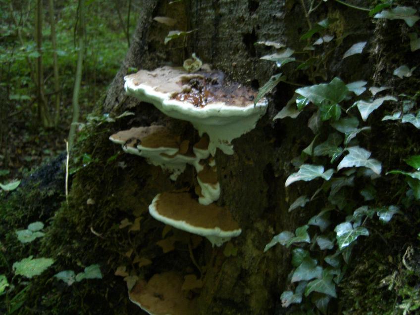 Dann fand ich noch diese Fruchtkörpergruppe eines Porlings. Evtl. der abgeflachte Schichtporling, Ganoderma applanatum. Sicher bin ich mir da keineswegs.