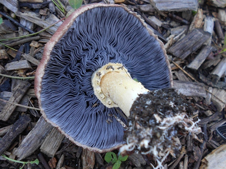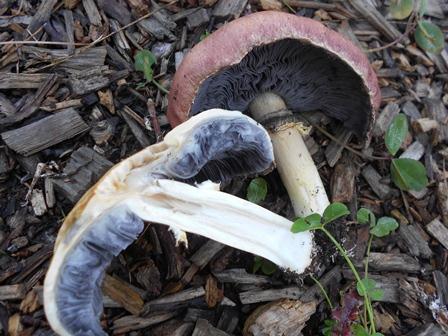 im Jungstadion sind die Kappen zum Teil mit Steinpilzen braun/gelb zu verwechseln, zum Teil dunkellila oder rotbraun und werden je nach Alter immer heller. Die Lamellen sind in diesem Stadion noch weiß, später werden diesejedoch dunkelgrau und geben dunkle (die Finger sind danach schwarz) Sporen ab. Drucktest am Stil = fest, ebenso die Kappe (im Jungzustand). Geteilt merkt man, dass der Stil in der Mitte etwas "weicher" ist, aussen jedoch fest. Farbveränderung nach dem Schnitt gibt es keine, auch keine nach Druck auf das aufgeschnittene Pilzfleisch.