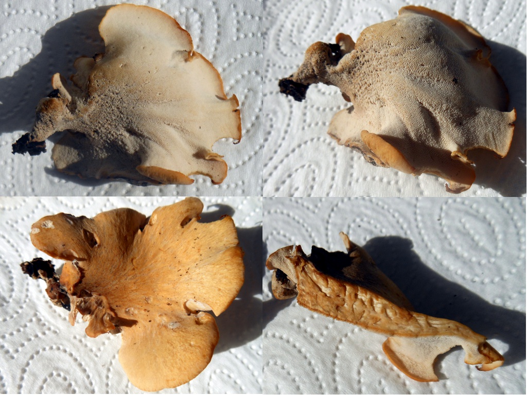 Die Unterseite ist mit feinen weißen bis cremefarben Poren überzogen die bis an die Schnittstelle zum Stamm reichen.