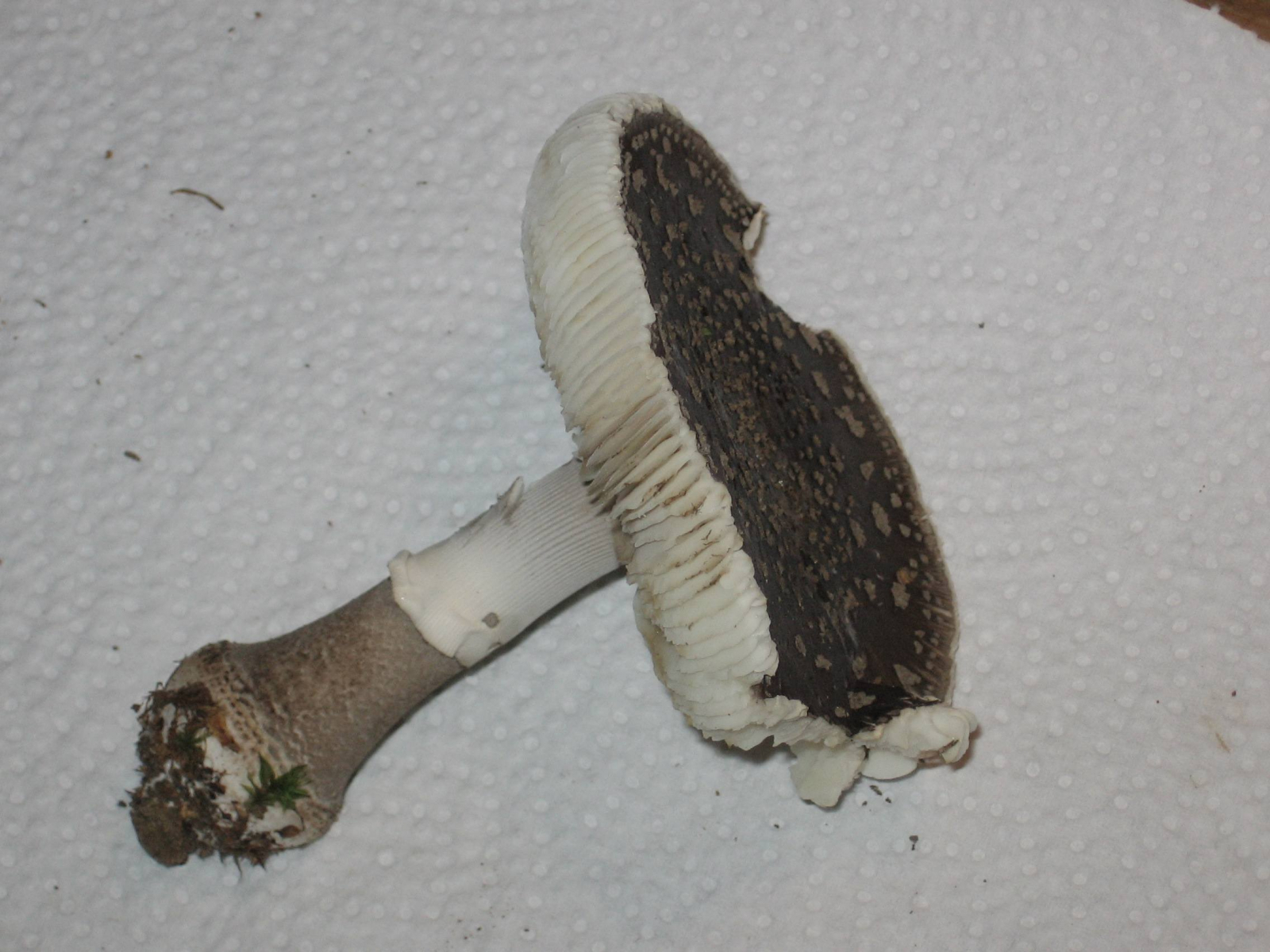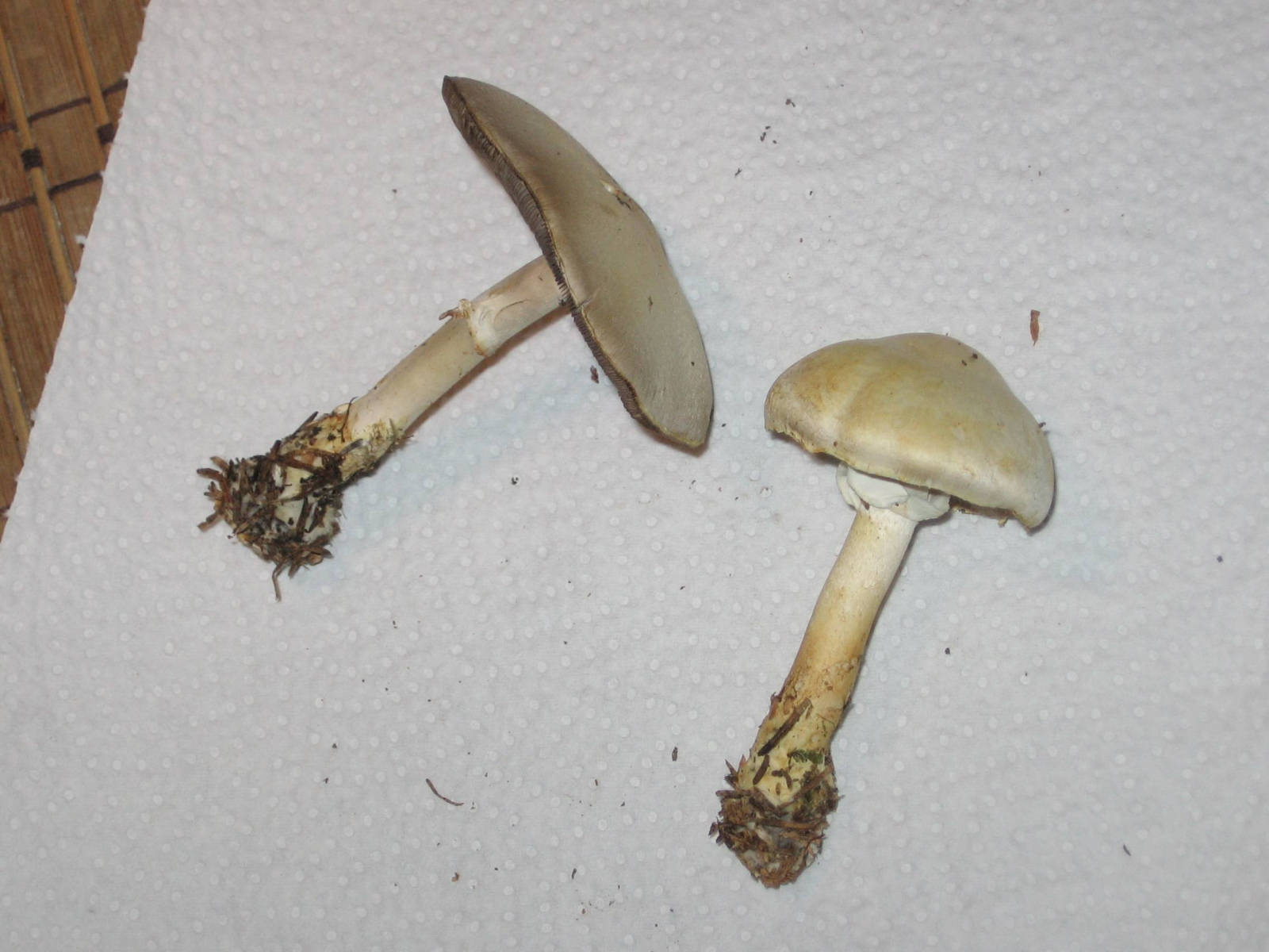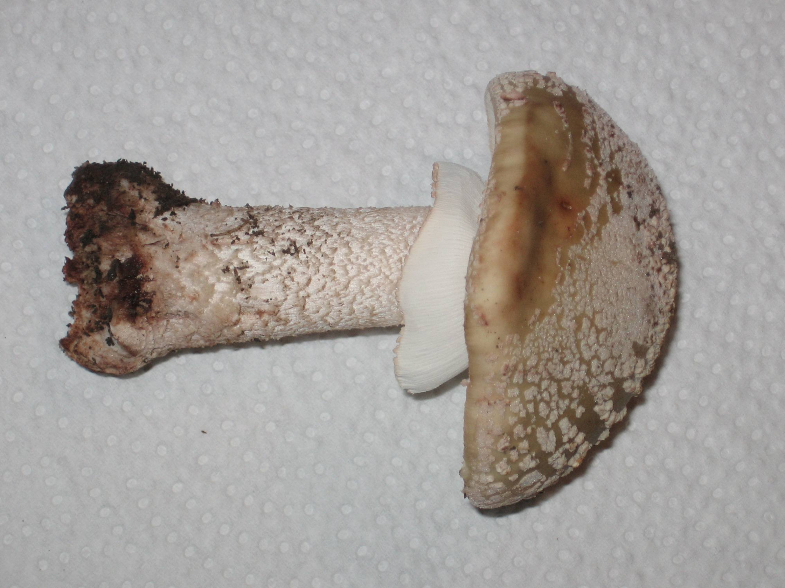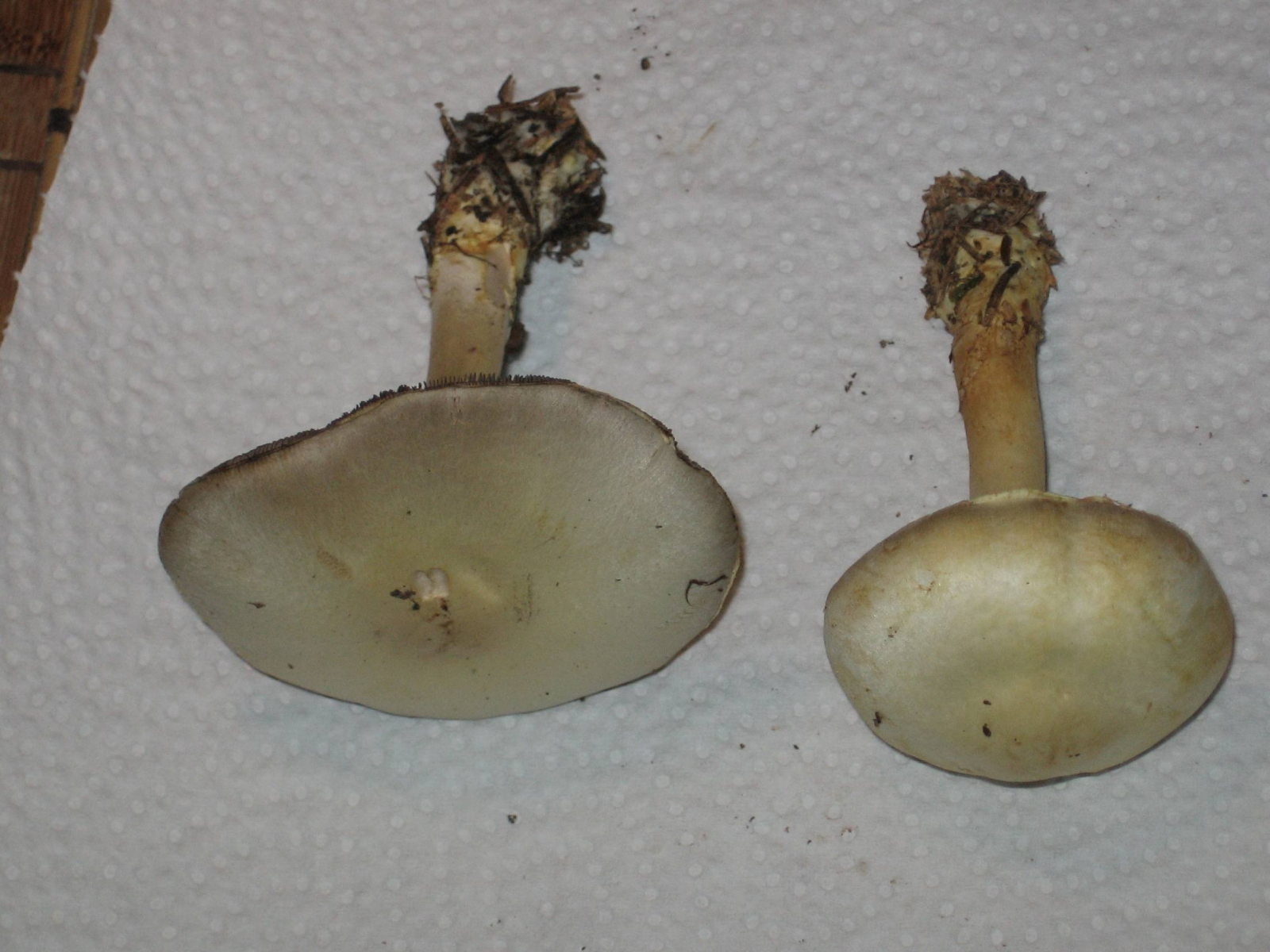Ja, und dann hätte ich mal wieder zwei weiße Pilze, die im Wald wirklich noch total weiß waren (sie standen nebeneinander, ich habe beide mitgenommen, um die Bestimmung zu erleichtern), aber bis zur Heimkehr stark nachdunkelten und nun eher grüngraubeigeocker ;o) sind. Der ältere hat nun einen ziemlich dunklen Hutrand, die Huthaut ist als Streifen bis zur Mitte abziehbar. Beide hatten einen Ring, der aber bei einem nun nicht mehr so gut zu sehen ist. Sie gilben nicht bei Verletzung, die Stiele sind gegen die Basis inzwischen ockerfarben geworden. Besonders der jüngere duftete beim Ernten ganz köstlich, fast wie parfümiert, gar nicht nach Pilz, aber mittlerweile hat sich der Geruch verloren.