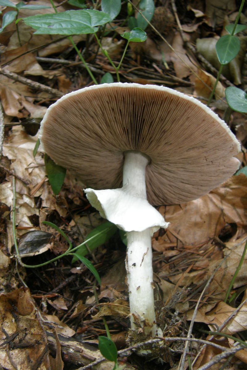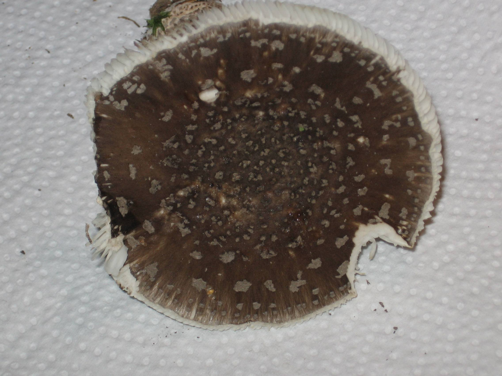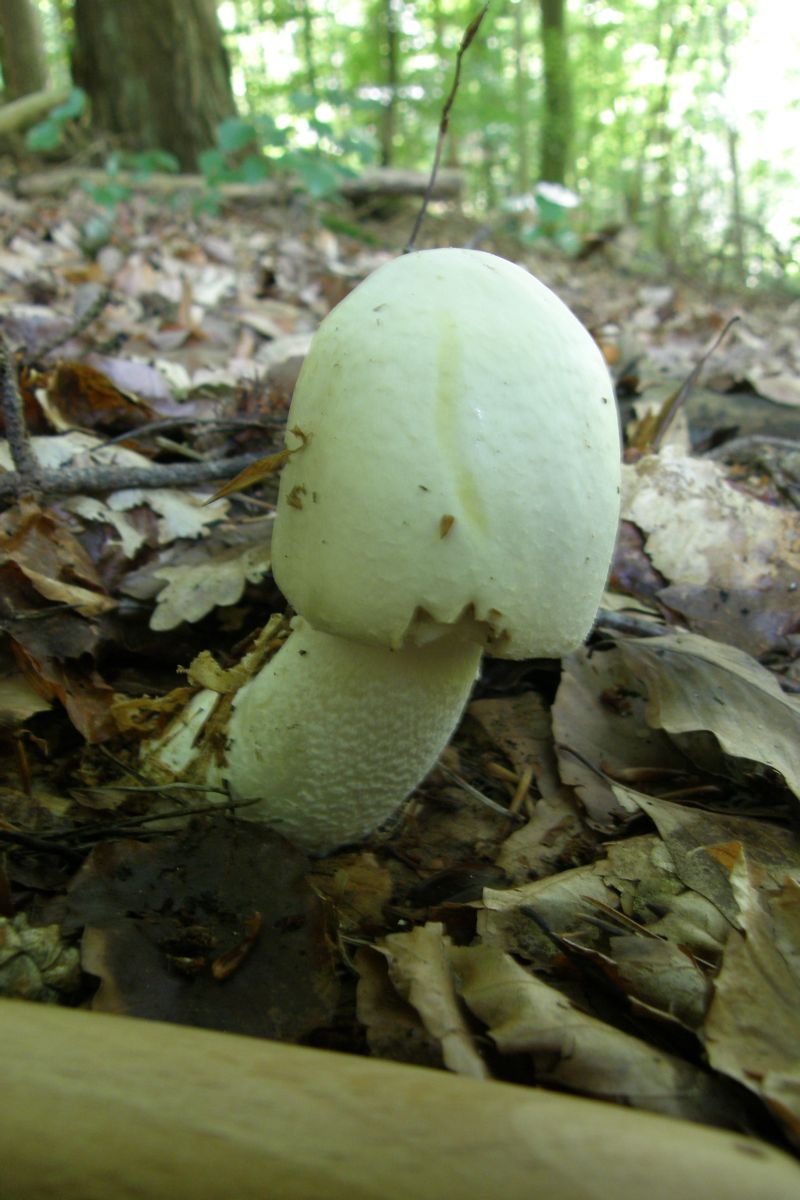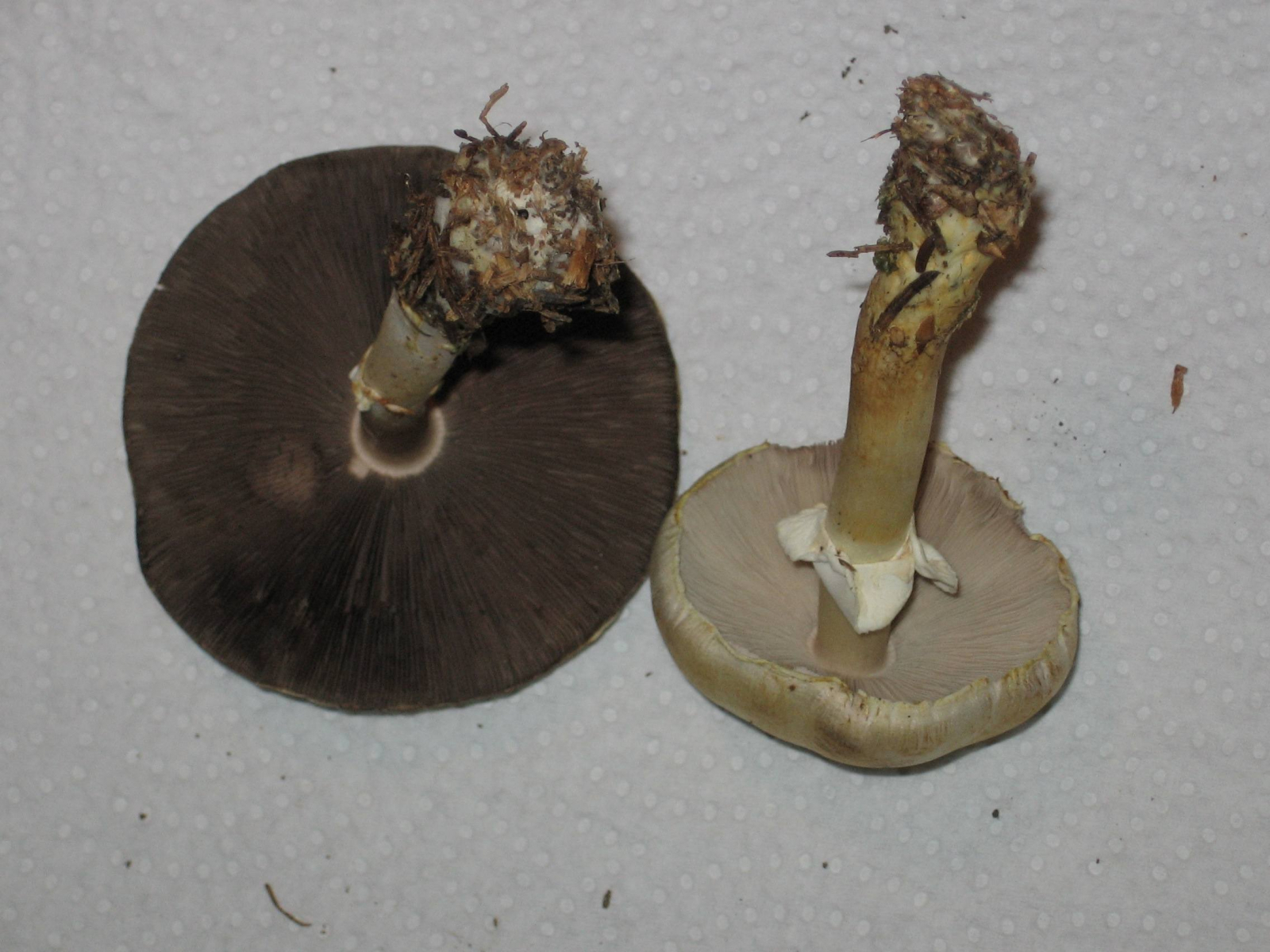 Ja, und dann hätte ich mal wieder zwei weiße Pilze, die im Wald wirklich noch total weiß waren (sie standen nebeneinander, ich habe beide mitgenommen, um die Bestimmung zu erleichtern), aber bis zur Heimkehr stark nachdunkelten und nun eher grüngraubeigeocker ;o) sind. Der ältere hat nun einen ziemlich dunklen Hutrand, die Huthaut ist als Streifen bis zur Mitte abziehbar. Beide hatten einen Ring, der aber bei einem nun nicht mehr so gut zu sehen ist. Sie gilben nicht bei Verletzung, die Stiele sind gegen die Basis inzwischen ockerfarben geworden. Besonders der jüngere duftete beim Ernten ganz köstlich, fast wie parfümiert, gar nicht nach Pilz, aber mittlerweile hat sich der Geruch verloren.