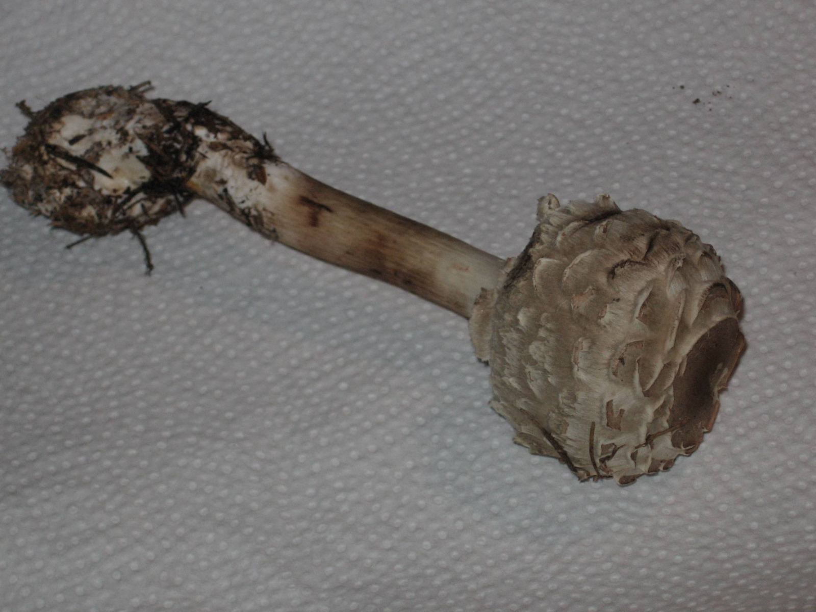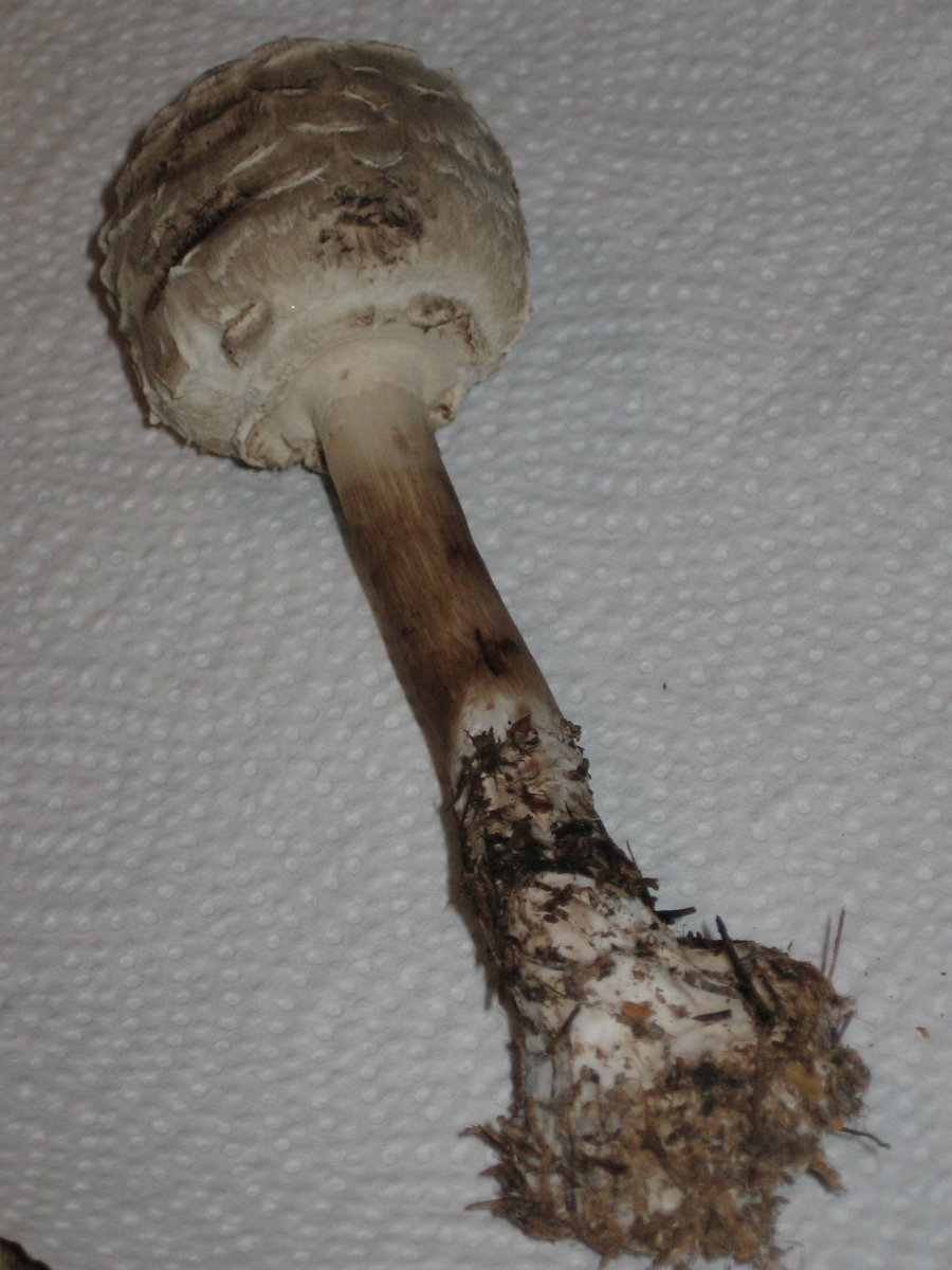 Die Bilder 2 und 3 zeigen m.E. einen Safranschirmling, aber da hoffe ich auf Eure Hilfe, ich hab noch nie einen gefunden - ein Daumennagelabdruck im Stiel färbte sich zuerst lachsfarben, dann dunkel-rotbraun, und die mir bekannte Natterung am Stiel eines Parasol fehlt völlig.