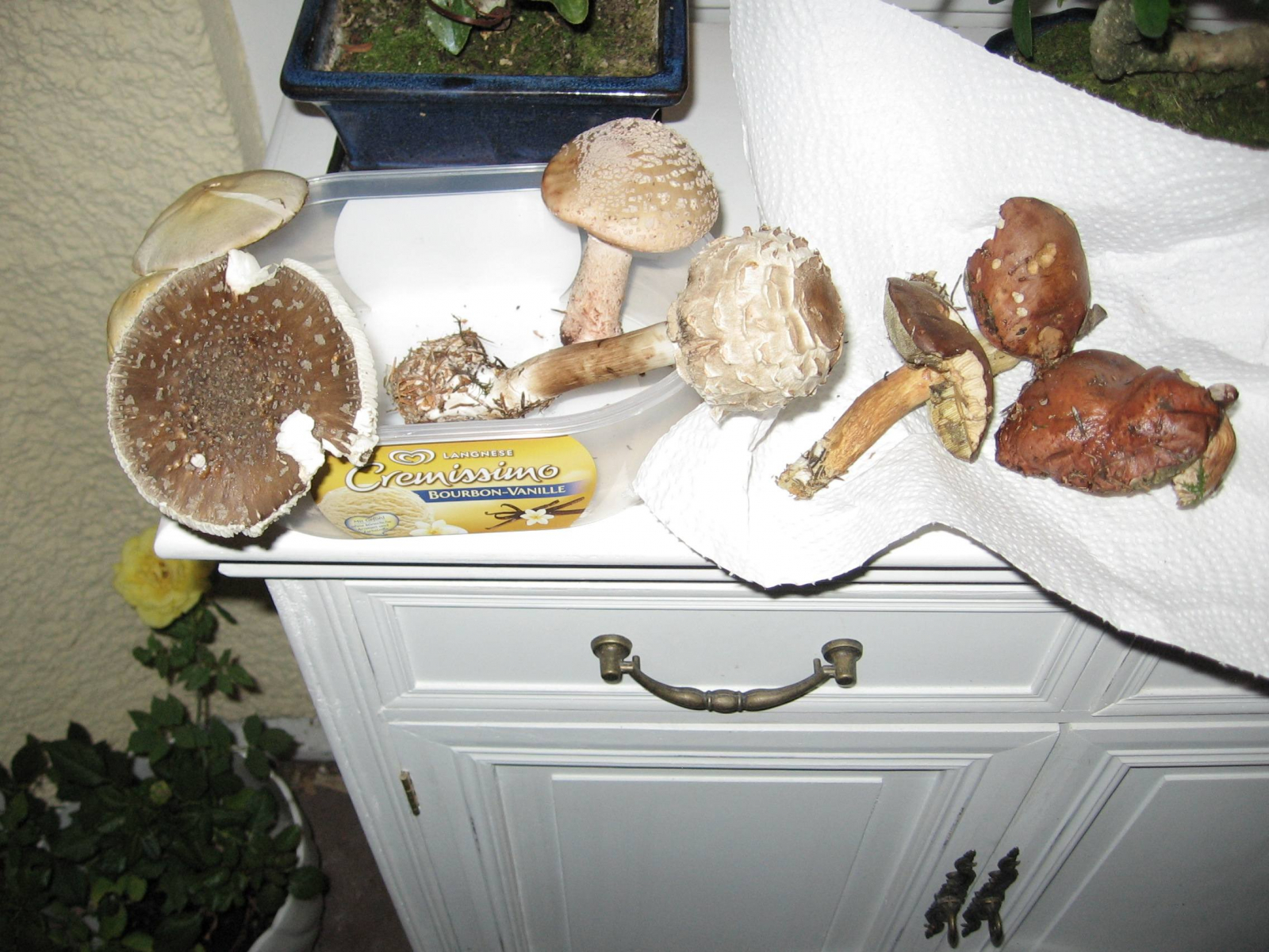 Das letzte Bild zeigt den Gesamtfund - alle Pilze standen im Forst auf einem sehr dicht bewachsenen, schattigen und feuchten Gebiet von höchstens 50x50 Metern mit vielen Fichten, Moos und Nadeln auf dem Boden, aber auch Laubbäumen dazwischen. Es gab dort auch noch Fliegenpilze, jede Menge Täublinge - und vor 2 Wochen gar Semmelstoppelpilze. Ein prima Fleckchen also :o).