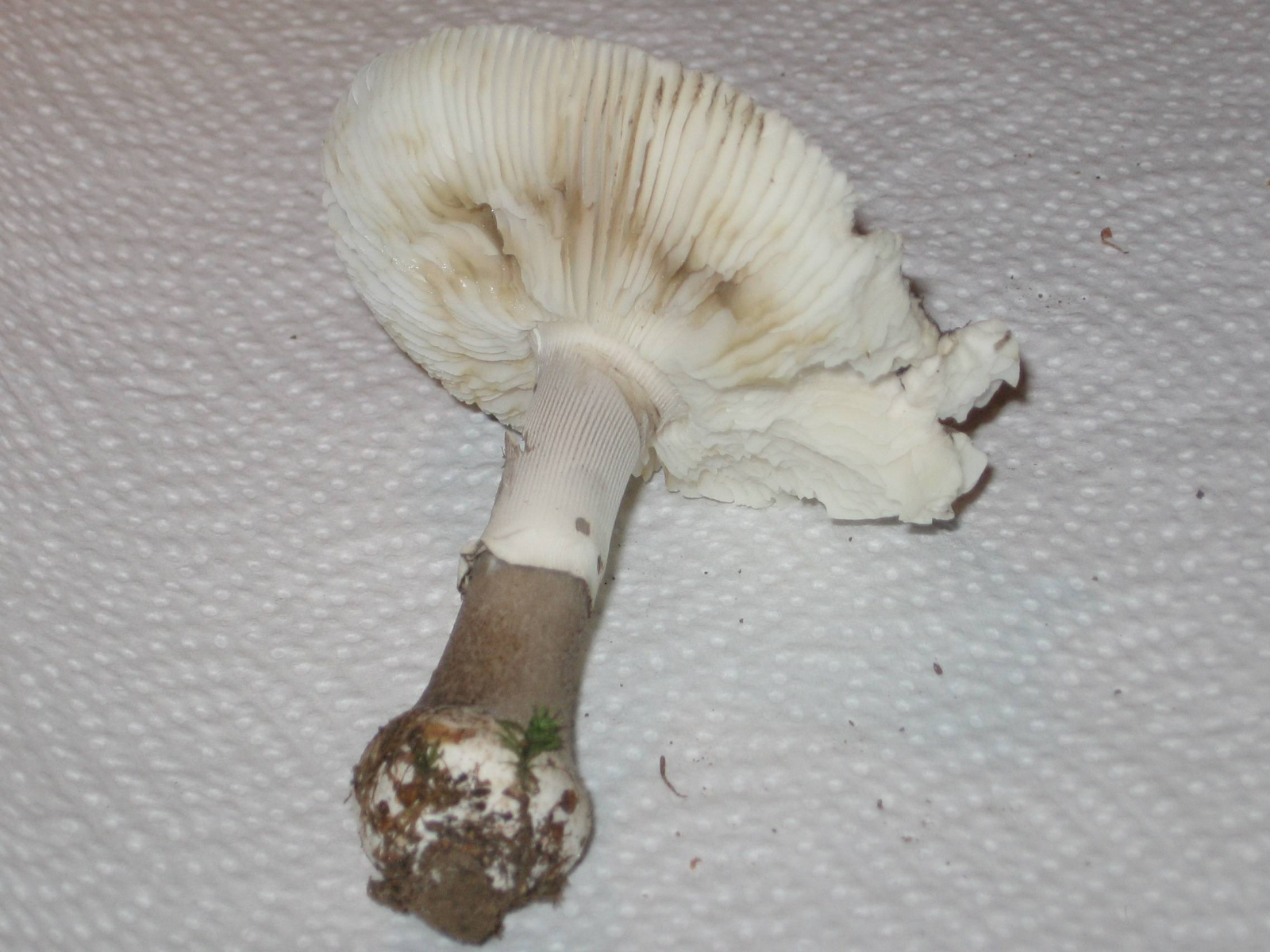 Ja, und dann hätte ich mal wieder zwei weiße Pilze, die im Wald wirklich noch total weiß waren (sie standen nebeneinander, ich habe beide mitgenommen, um die Bestimmung zu erleichtern), aber bis zur Heimkehr stark nachdunkelten und nun eher grüngraubeigeocker ;o) sind. Der ältere hat nun einen ziemlich dunklen Hutrand, die Huthaut ist als Streifen bis zur Mitte abziehbar. Beide hatten einen Ring, der aber bei einem nun nicht mehr so gut zu sehen ist. Sie gilben nicht bei Verletzung, die Stiele sind gegen die Basis inzwischen ockerfarben geworden. Besonders der jüngere duftete beim Ernten ganz köstlich, fast wie parfümiert, gar nicht nach Pilz, aber mittlerweile hat sich der Geruch verloren.