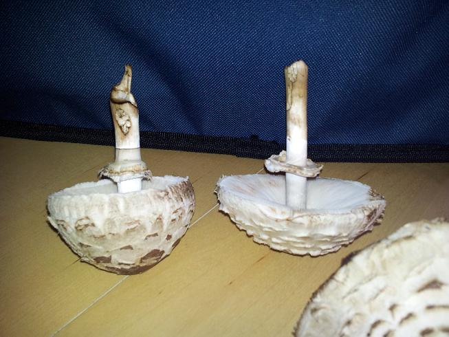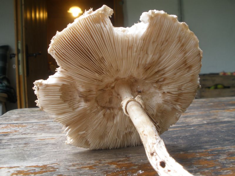 Aufgrund des Anfassens entstanden wohl Druckstellen im Bereich des Schirms / der Lamellen, die eine helle rotbräunliche Verfärbung erkennen lassen (die nach einiger Zeit wieder verschwindet). Deshalb schließe ich auf den Rötenden Schirmling = Safranschirmling = macrolepiota rhacodes und nicht auf den Großen Schirmling= Parasol = macrolepiota Procera.