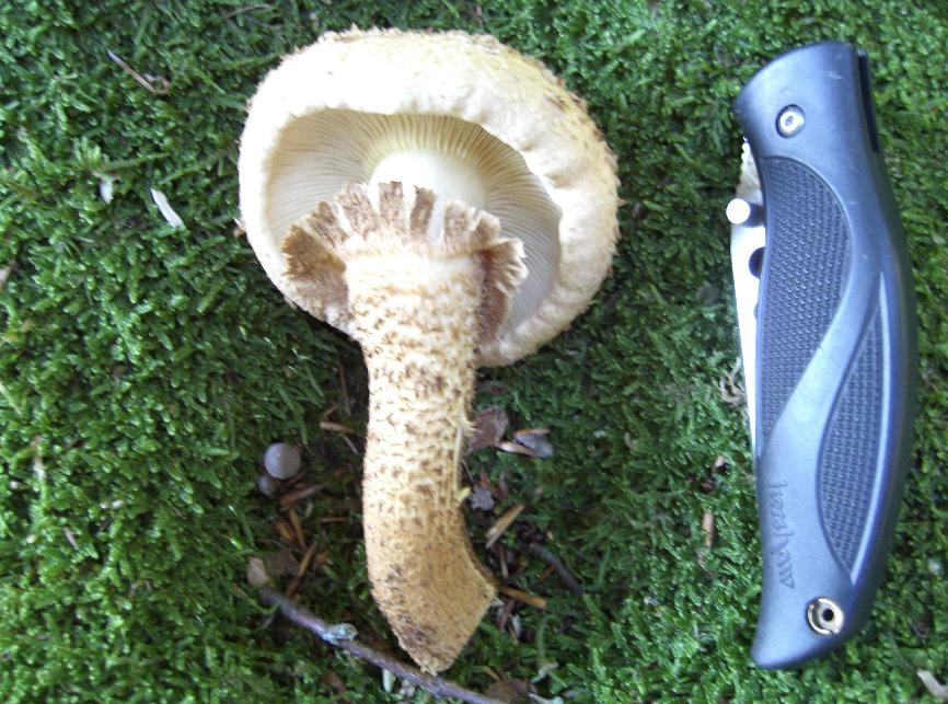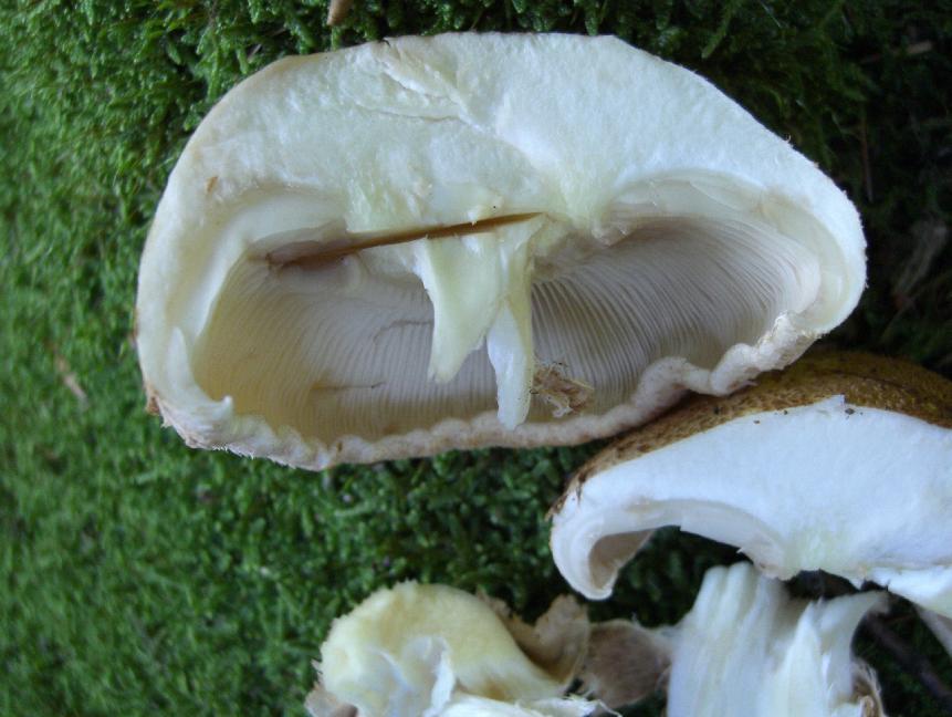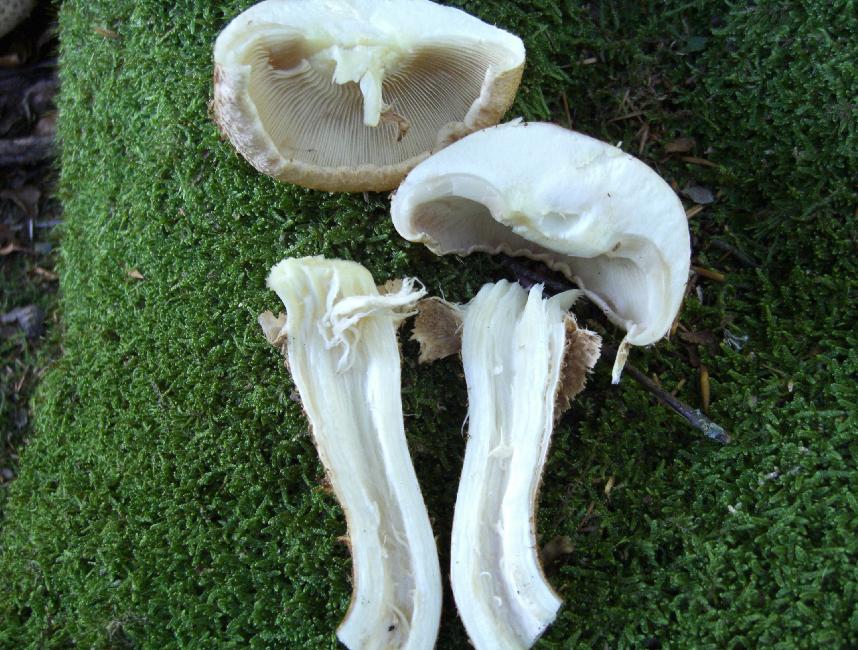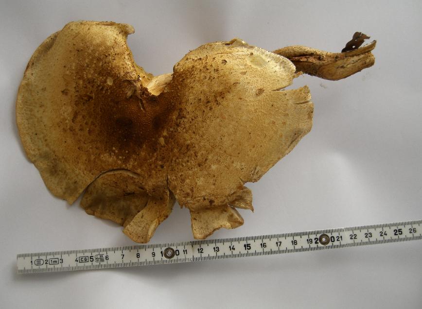 Mein ständiger Begleiter daneben misst im gezeigten Zustand 11 cm. Keine wesentliche Reaktion auf Druck und Schnitt, jedoch ein angenehm Zitrusfrüchteähnlicher Geruch nach dem Aufschneiden, insbesondere des Stiels. Eine deutlichere Gelbverfärbung entstand nur an der Verbindung vom Stiel zum Hut. Die Konsistenz würde ich als fest, zäh, gummiartig beschreiben.