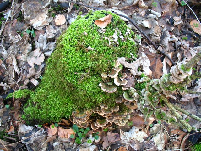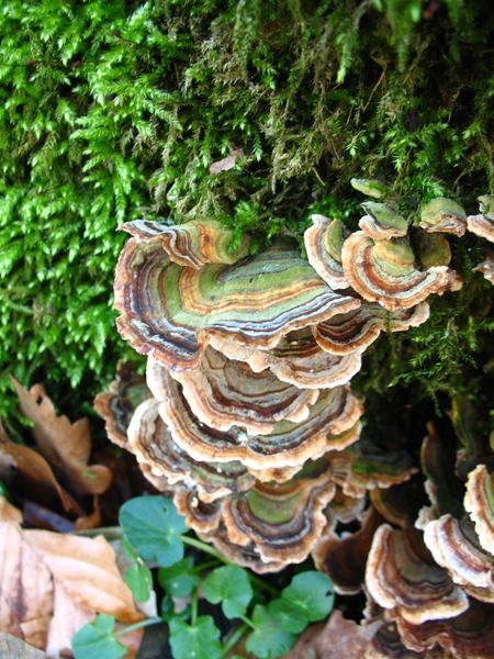heißt mit Vornamen ziemlich sicher Tramete/Trametes - nur über den Nachnamen bin ich mir nicht so ganz im Klaren. Vielleicht ist es T. versicolor, die Schmetterlings-Tramete. Die grünen Zonen auf der Hutoberfläche sind wohl durch Algen so gefärbt ...