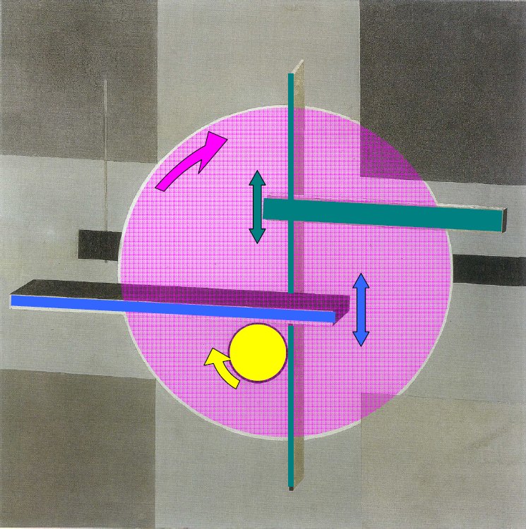 Dieses Bild, welches scheinbar 3-dimensional ist, wird in ein tatsächliches 3D-Objekt umgesetzt. Zusätzlich wird die große Scheibe mit etwa 1 Umdrehung pro Minute rotieren, die kleine Scheibe rotiert ungleichmäßig/ruckartig und macht dabei Klackergeräusche. Die "Balken" pendeln hin- und her. Das Objekt hat eine Front von 99cm mal 99cm und eine Dicke von ca.12 bis 15cm. Das Gewicht soll möglichst bei unter 10kg liegen.