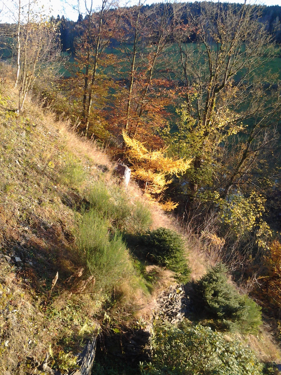 Das sehe ich, wenn ich hier aus dem Fester gucke (Herbst) und mich macht das jeden Tag fröhlich, dass ich jetzt am Wald wohnen darf.