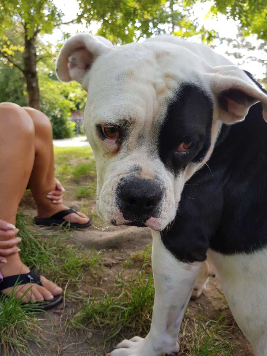 Duplo sieht auch so kampfhundig verschmust aus. Seltsamerweise sind gut geführte/gehaltene "Kämpfer" meist ungewohnlich feinfühlig und lieb und nicht so tramplig wie viele andere Rassen.