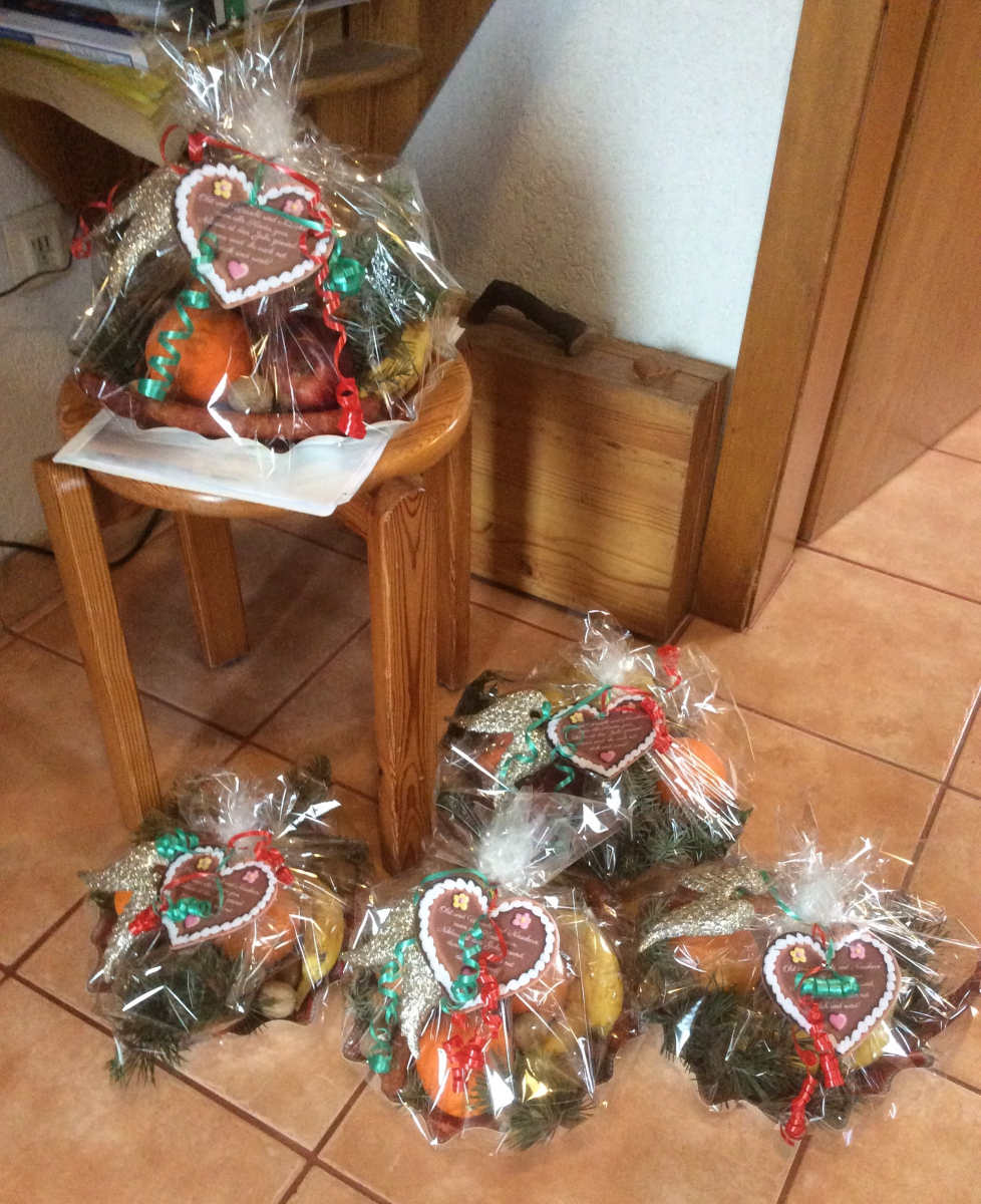 Auf den Tellern gab's dieses Jahr keine Süßigkeiten; nur Obst, Mettwürstchen und Nüsse...bin mal gespannt, was sie sagen!