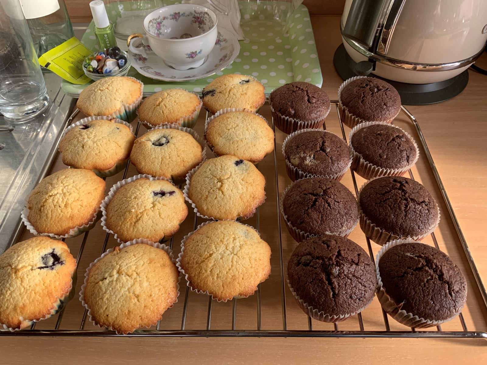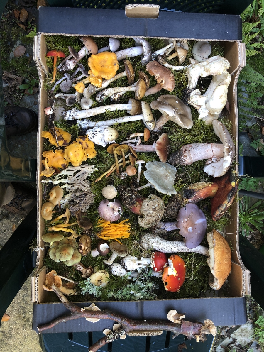 Hmmm, Blaubeermuffins, so lecker Tuppie. Bin gerade nach 5 Stunden für die Pilz-Ausstellung sammeln (Foto) und Pilze kontrollieren zurück, mit mäßigem Erfolg, wie zu sehen ist. Dabei ist der Wald quietschnass.