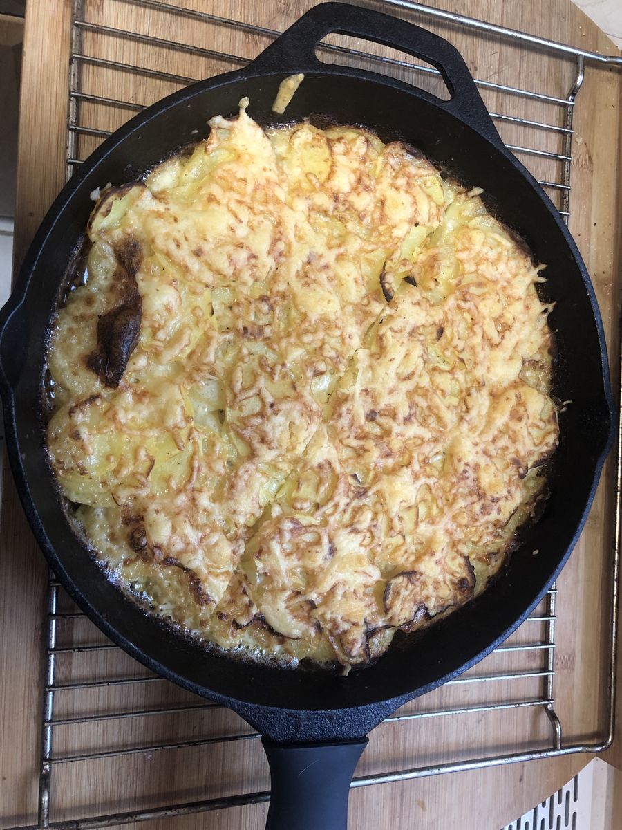 Außer dem Genannten noch ist nur Sahne Pfeffer, Salz und vieeel Knoblauch dran. Nicht zu viel Käse oben drauf, nur dass der gerade so eine dünne Kruste bildet. Alles zusammen bei 200 - 220 Grad Umluft in den Backofen, bis die Flüssigkeit weg ist und die Kartoffeln gar sind, ca. eine halbe Stunde.