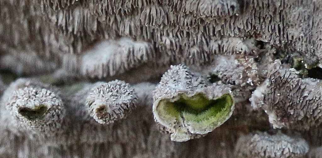 Der bläulichgraue Fichtenschichtpilz wird es wohl auch nicht sein. Der hat nicht solche "Zotten".