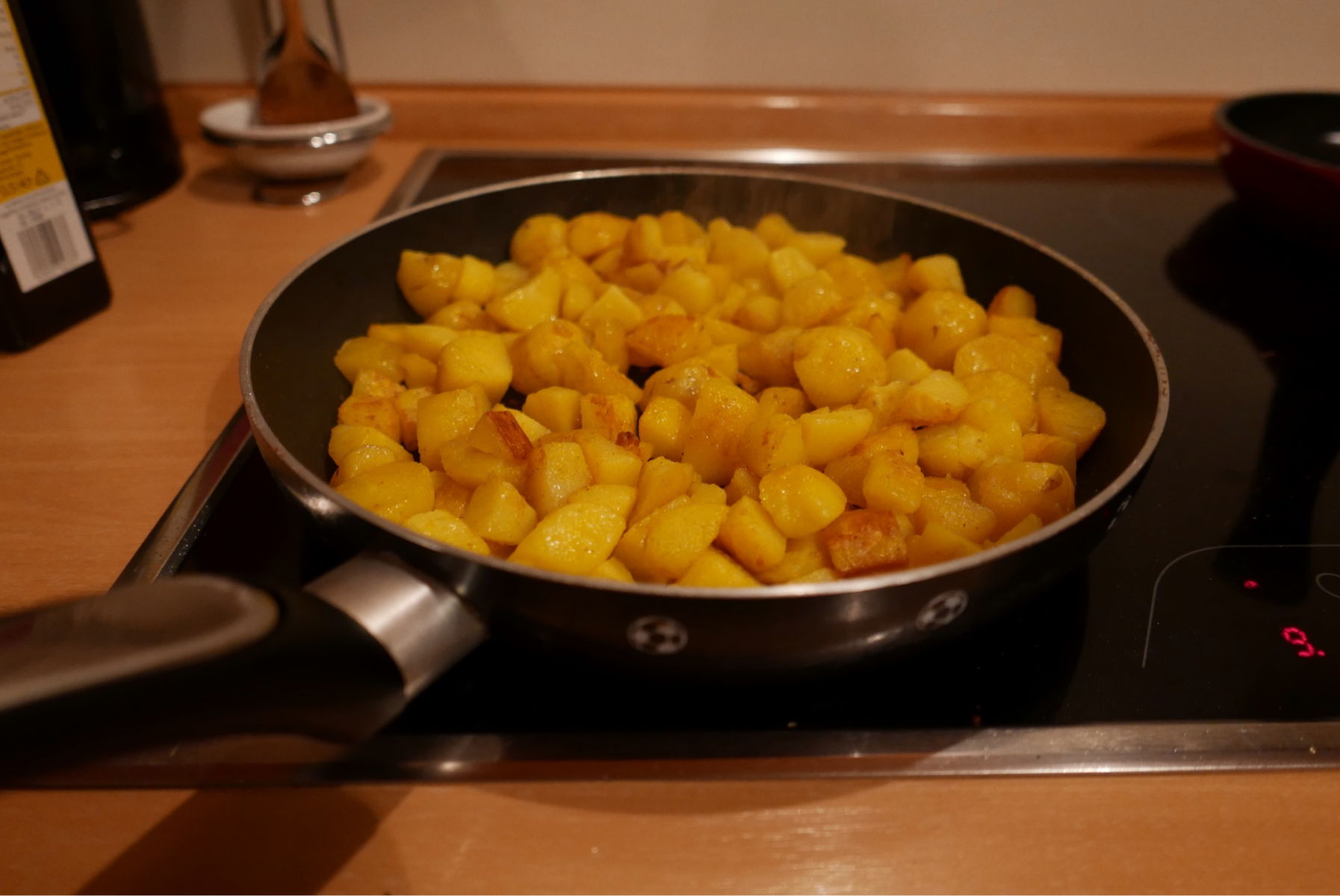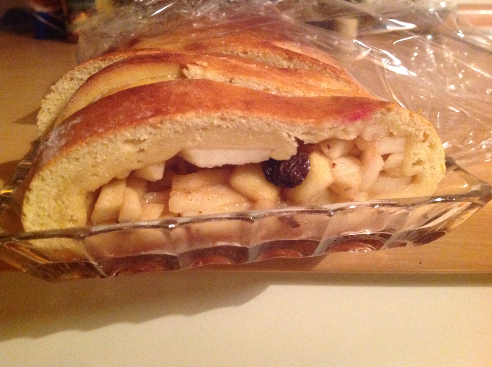 Ja, eine Art Apfelstrudel mit Hefeteig. Ein bisschen fester dadurch. Gut, dann biete ich mal geschäumte Mandelmilch dazu. Kakao passt auch als Getränk. -