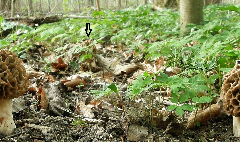 Eure Augen sind phänomenal. Ich hätte die Bonusmorchel auf dem Bild nie gefunden, wenn ich nicht wüsste, daß sie da ist.Den morchligen Gucker im gebüsch hab' ich mal noch markiert, so ist er besser zu sehen: