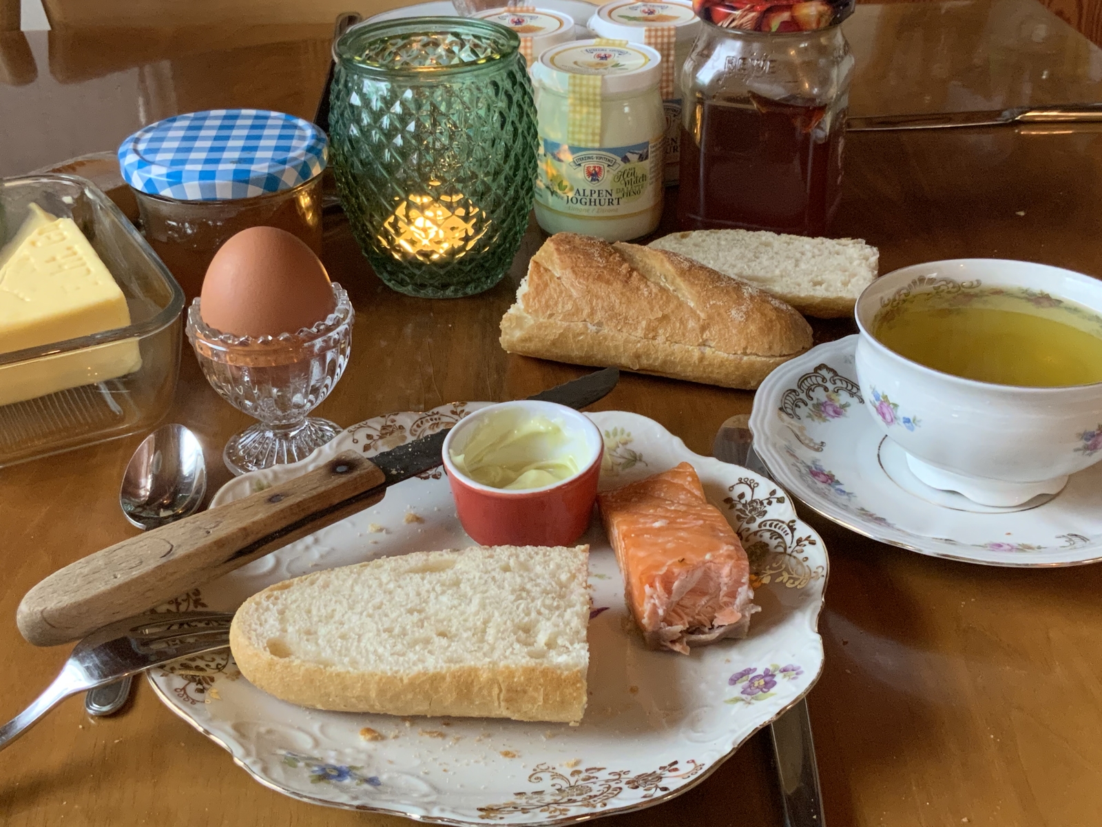 Möchte mir jemand beim Frühstück Gesellschaft leisten? Eier von Glücklichen Hühnern, Stremellachs, selbstgekochte Gelees und Konfitüre, Wurst, Käse und Brötchen vom „echten“ Bäcker.