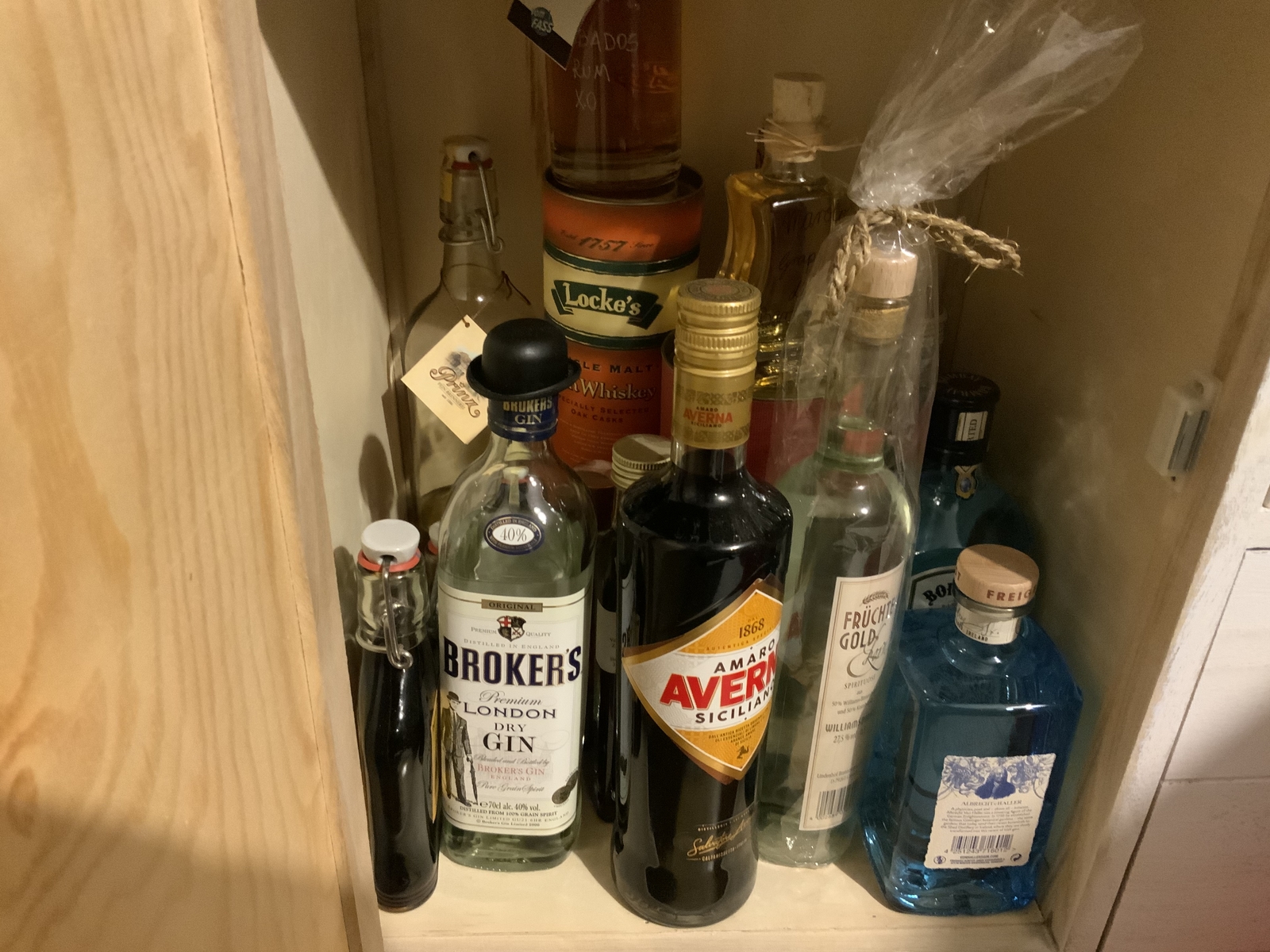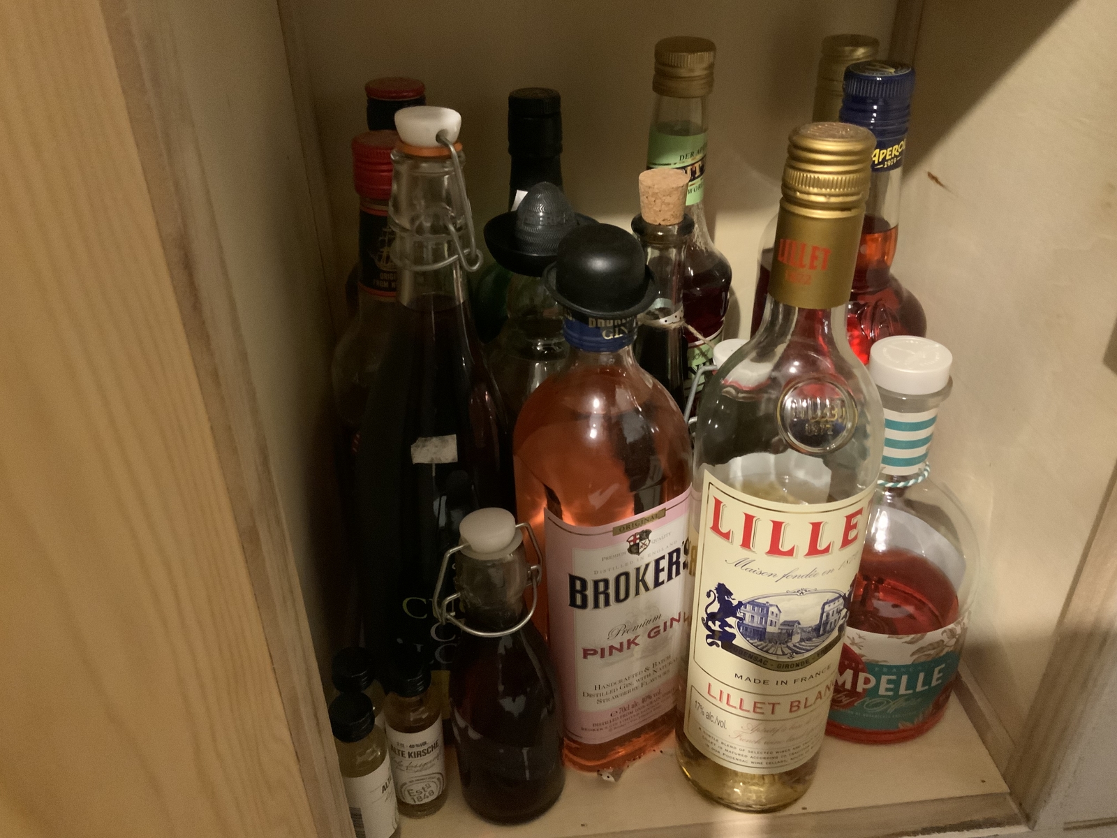 • Tja, das meiste in dem Giftschrank sind Geschenke, und dann, so alleine zu hause trinkt man doch eher keine Schnaps. Da sammelt sich was an…