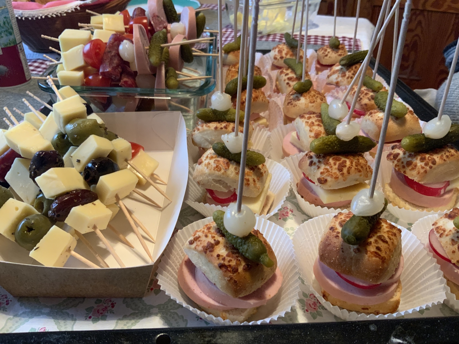 Die Spießchen waren mit Gouda, Tomate, Pfeffermettwurst, Silberzwiebel, Fleischwurst und Honig-Cornichon.