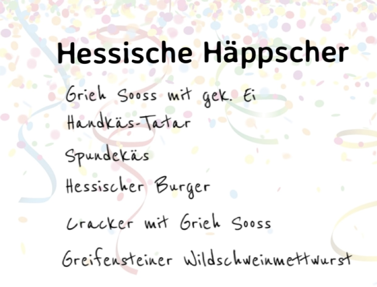 Noch mal Hessische Häppscher: die hatte ich schon einmal im letzten Jahr zur Fassenacht gemacht, allerdings viel aufwändiger, hier die Speisekarte: (Ein Foto von den Speisen finde ich gerade nicht, leider)