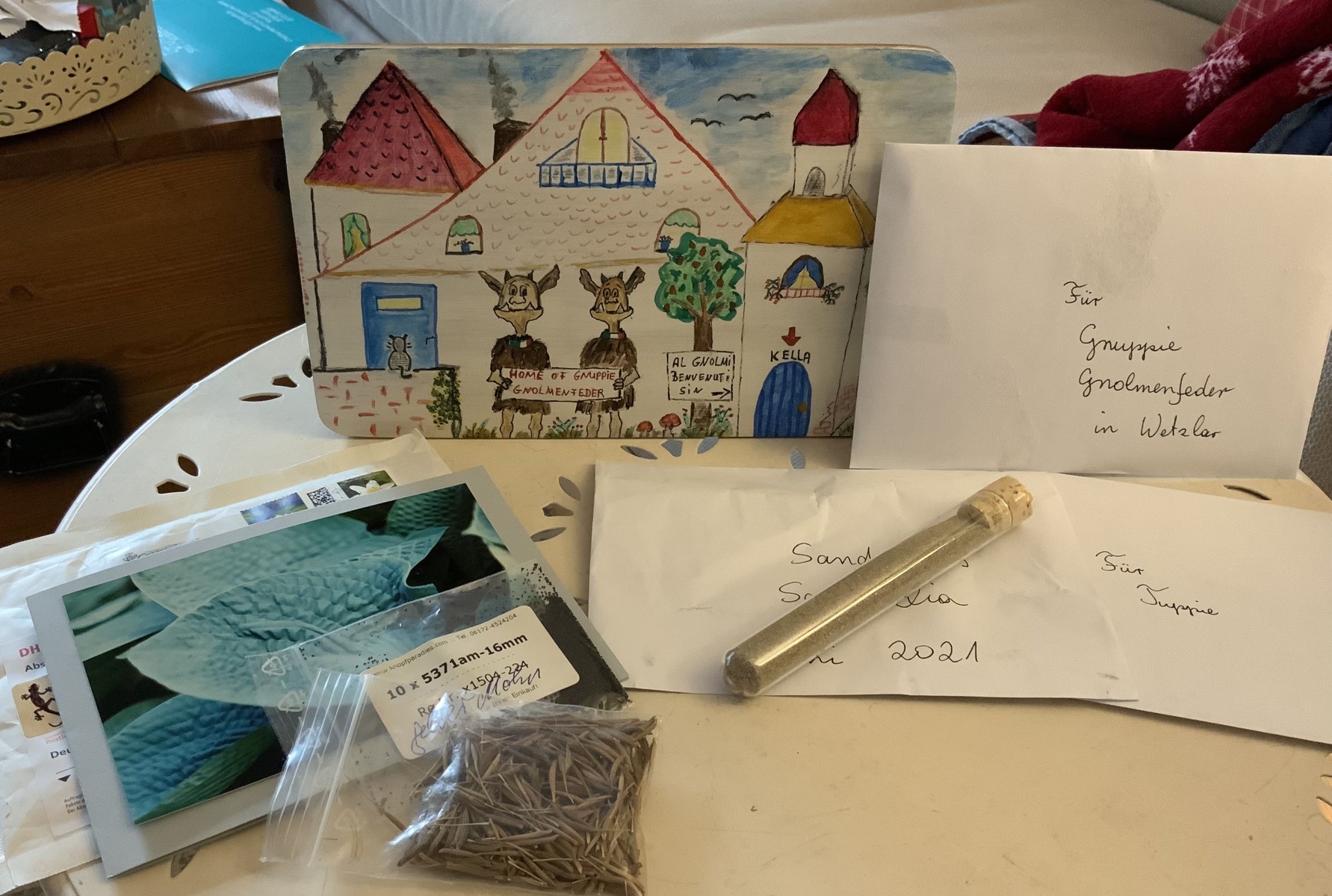 Ich habe Post bekommen von Kirsten mit einer schönen Karte und Sämereien und von Dodo und zwei Gnolmen, mit Sand und zwei Briefen und einem selbst gemalten Gnolmenportrait-Türschild!