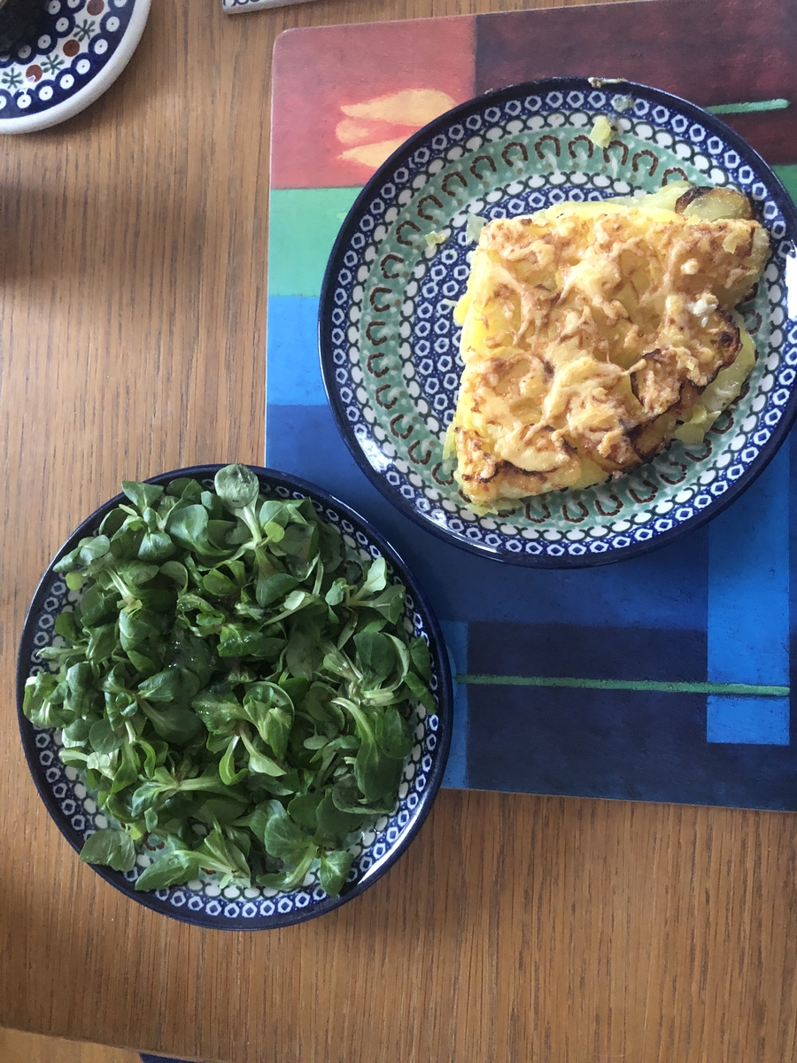 • Also, ich sehe Kartoffeln und Käse und Feldsalat, das ist schon mal unbedingt lecker. Aber was das ansonsten genau ist? Weiß nicht…