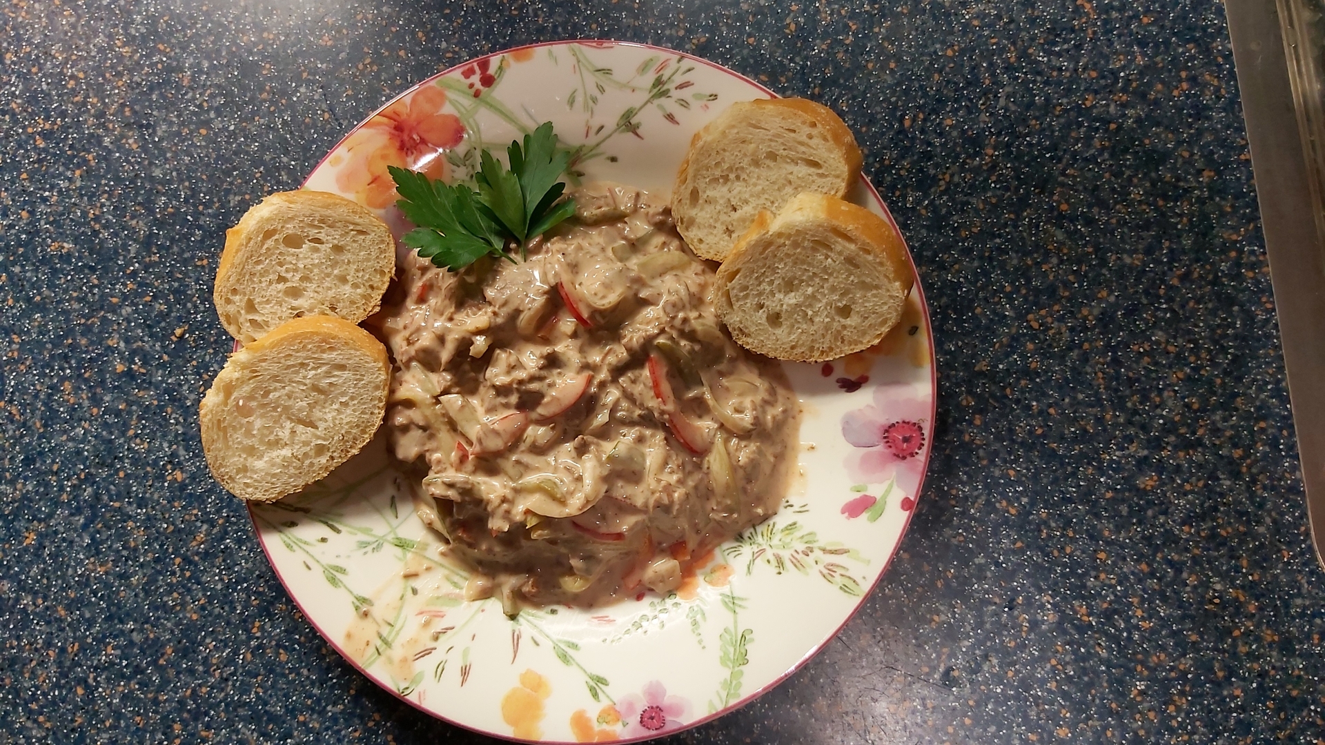 Lecker & Simpel, Rindfleisch, Zwiebeln, Paprikaschoten und Essiggurken in feine Streifen schneiden. Mit Mayonnaise, Ketchup und Gurkenessig binden und würzen.