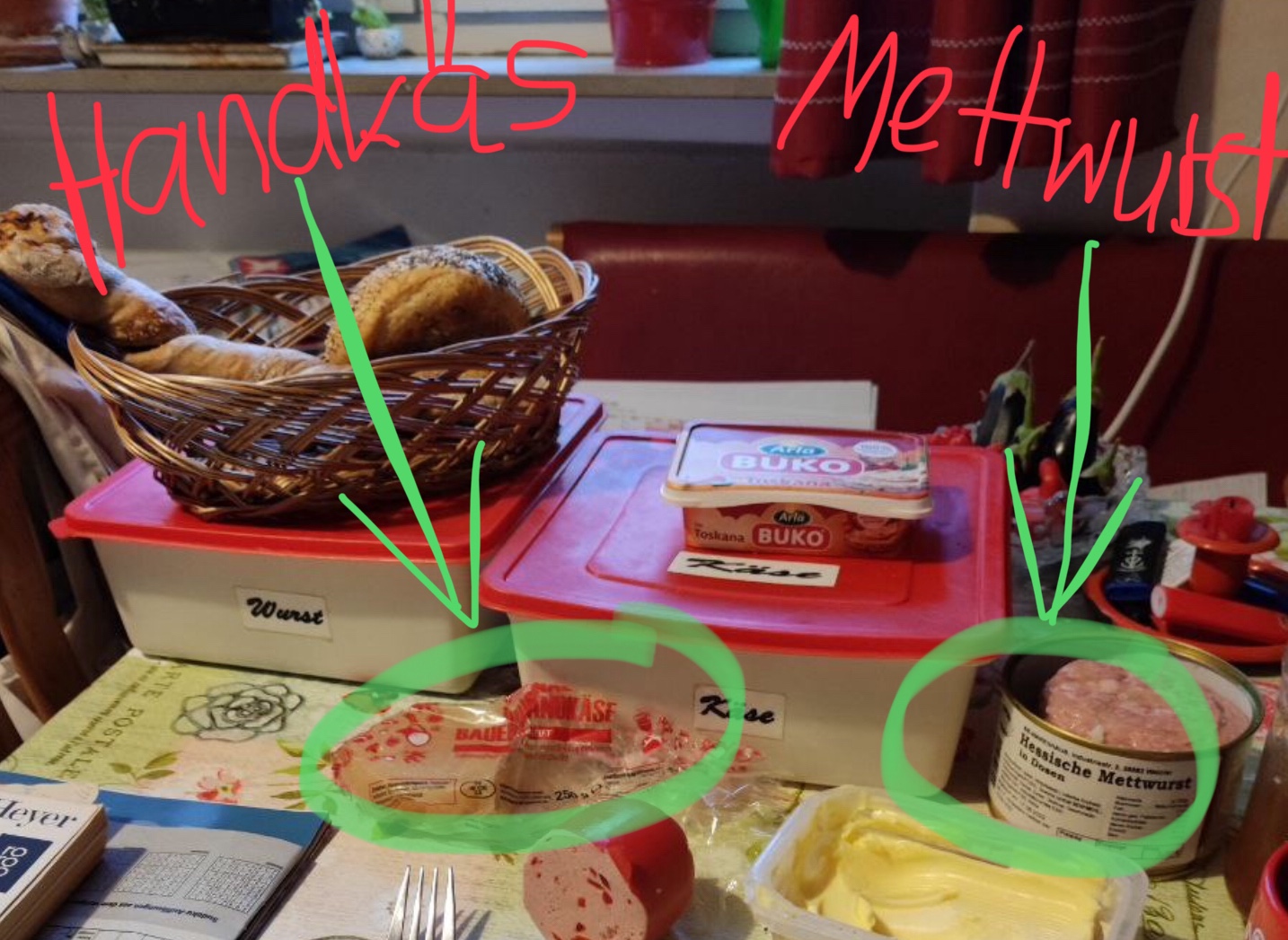 Nicht zu vergessen hessische Schmankerln, die für mich oft zu einem kräftigen Frühstück dazugehören: Der vielbeschworene Handkäs (s.o.!) und Mettwurst in der Dose. ==Pilz27