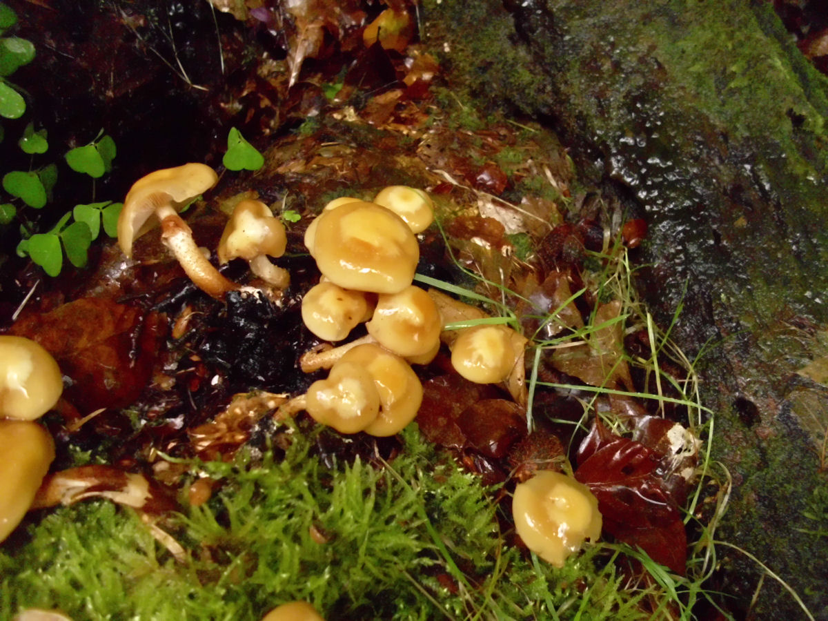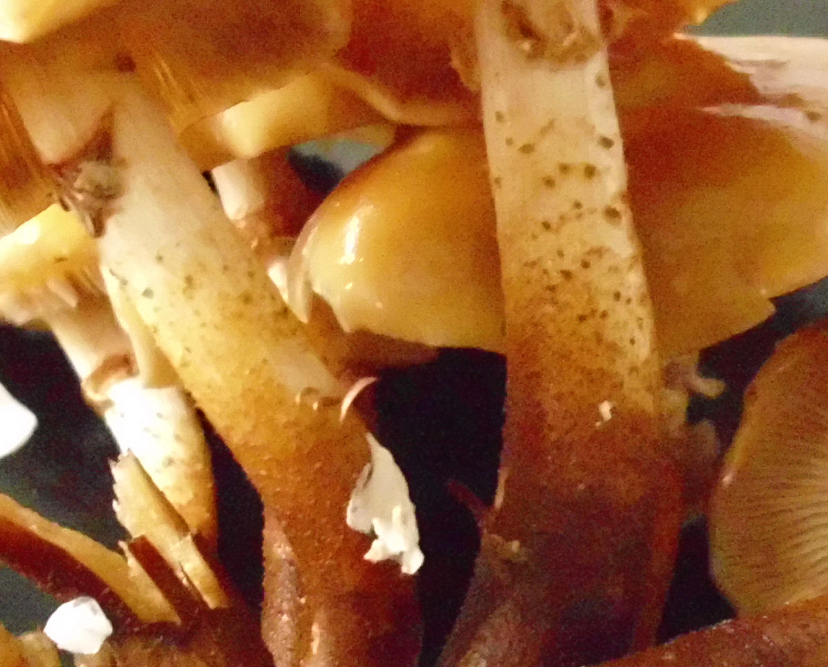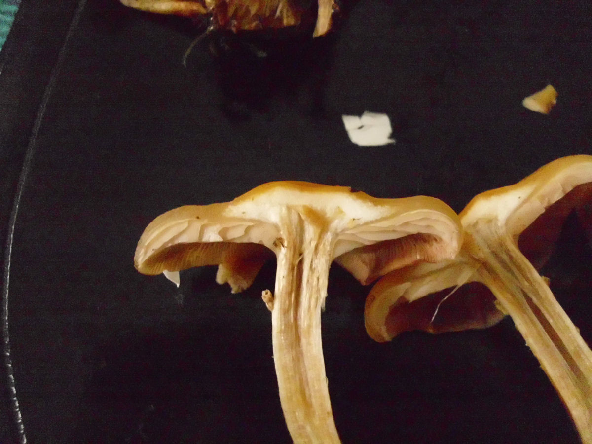 was mich auf den hallimasch brachte war, dass man den gelegentlich, wenn es nass ist und er älter ist, ohne die typische hutbeflockung (nennt man das so?) sieht. der stiel ist auch nicht ganz unähnlich. aber ich habe nicht sehr lange drüber nachgedacht.