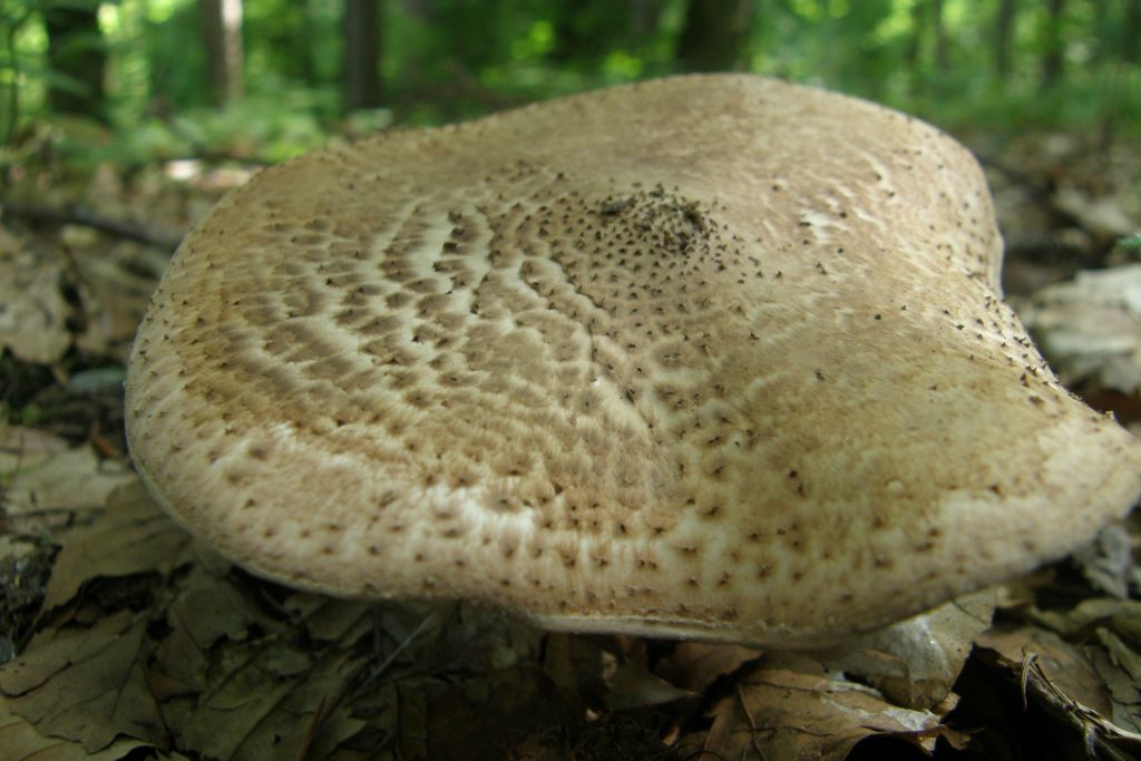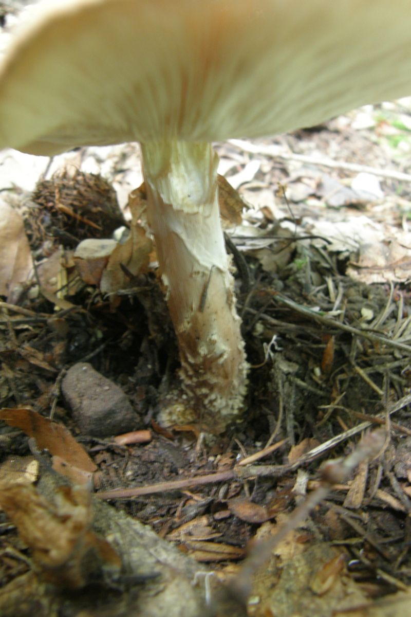 Hut bei den aufgeschirmten leicht gebuckelt- auf dem Buckel steinchenartige Schuppen (weich), die sich abwischen lassen.