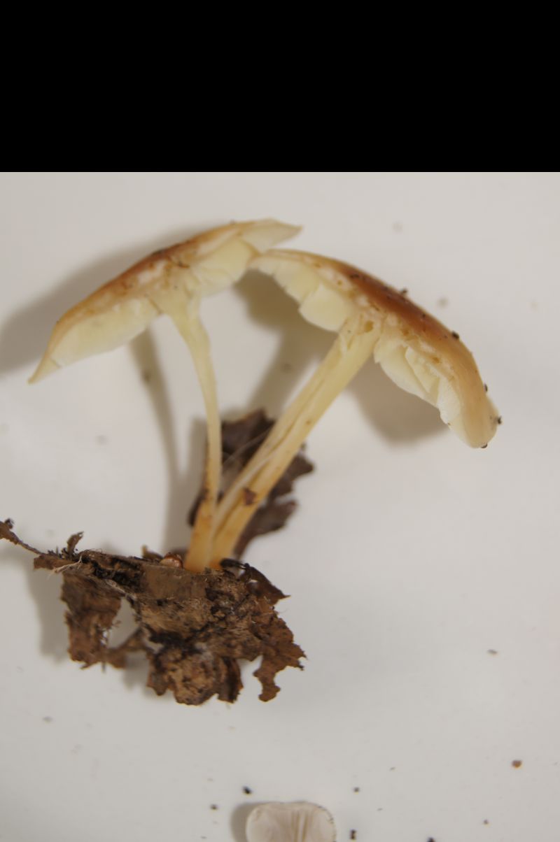 Fundort Buchenwald (Hochwald), Hutdurchmesser Pilz A bis 4, 5 cm, Pilz B 3 cm, beide ziemlich dichte Lamellen untermischt, beide Stiel hohl